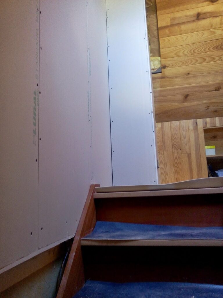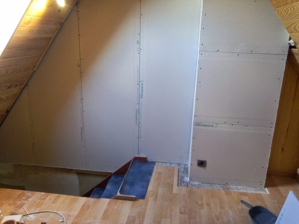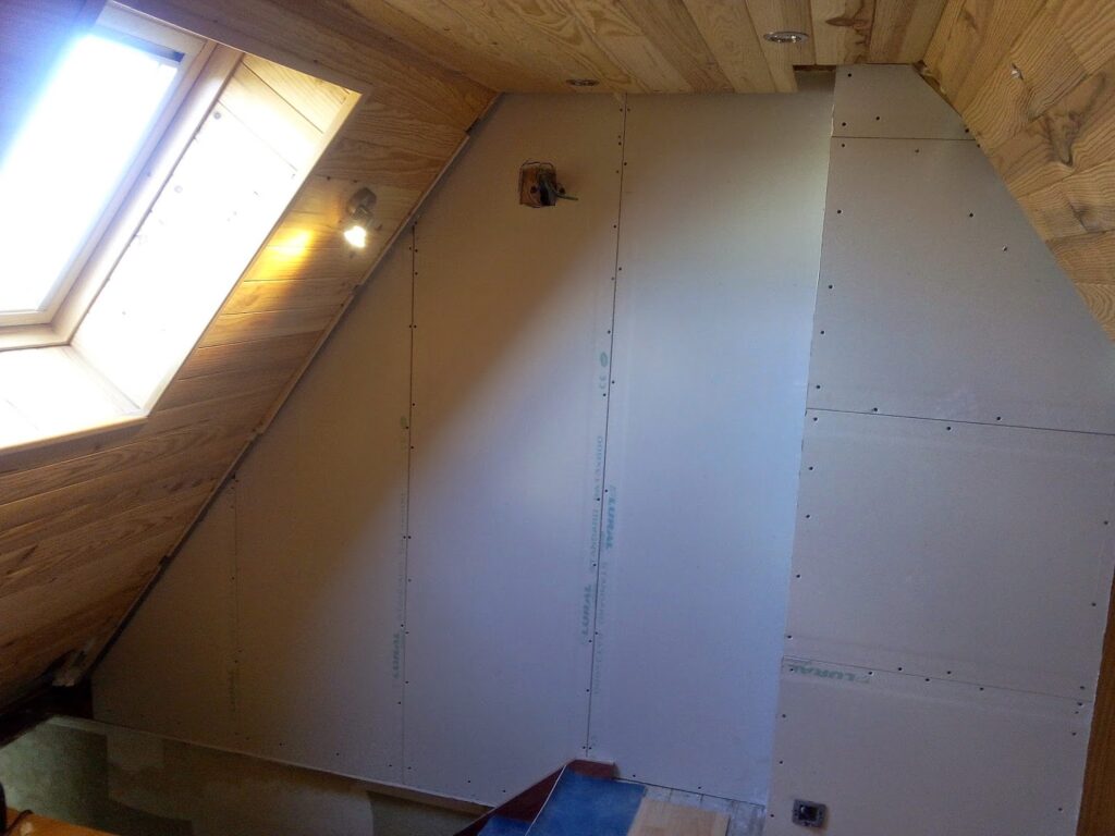 Samedi dernier, nous avons enfin avancé sur l’isolation : on avait dû virer le lambris et réduire l’épaisseur d’isolant pour laisser passer l’escalier. On a donc réinstallé la laine de verre et tout refait en placo. Il reste 75mm d’isolation contre 120 avant. Espérons que ça ira…