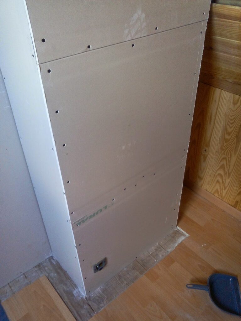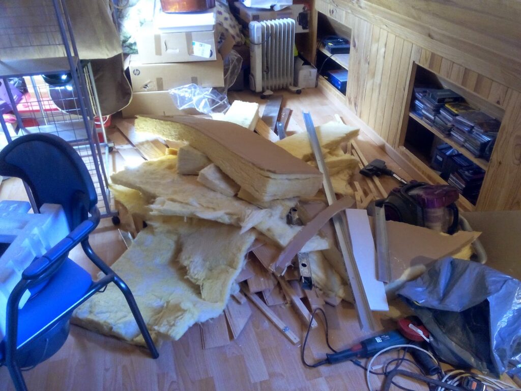 | Ici, on a dû virer toute l’épaisseur d’isolation,et refaire a notre idée … d’ou le gros trou à combler. |