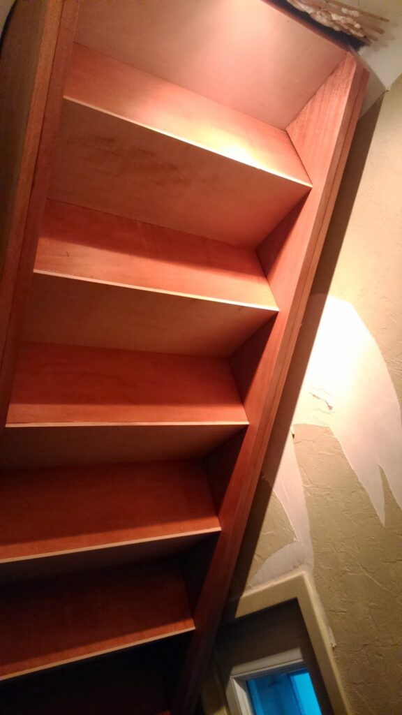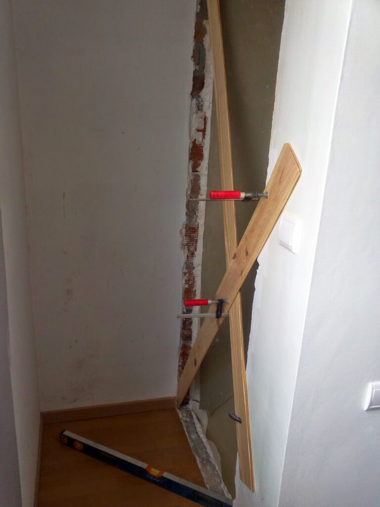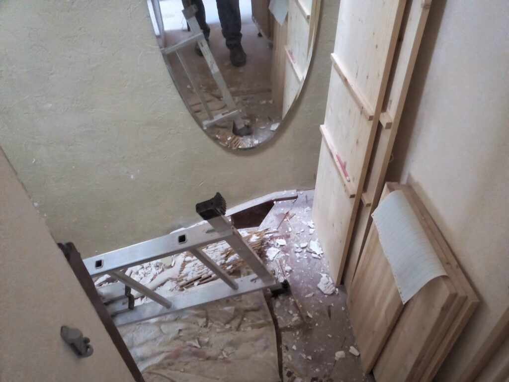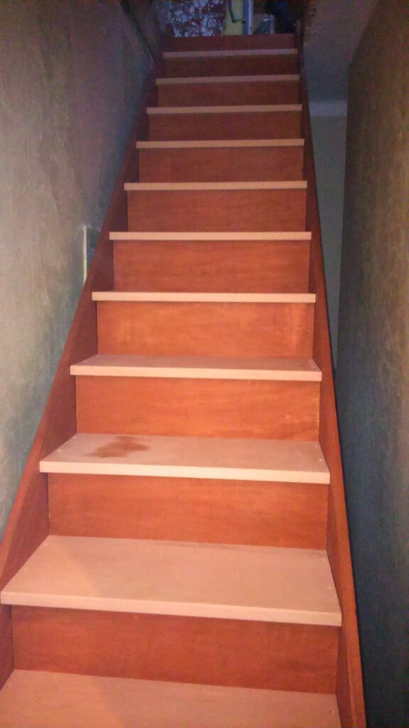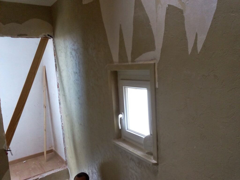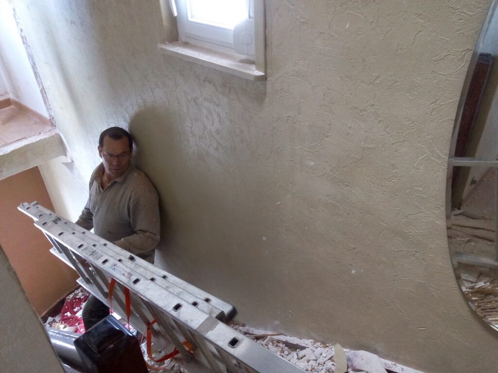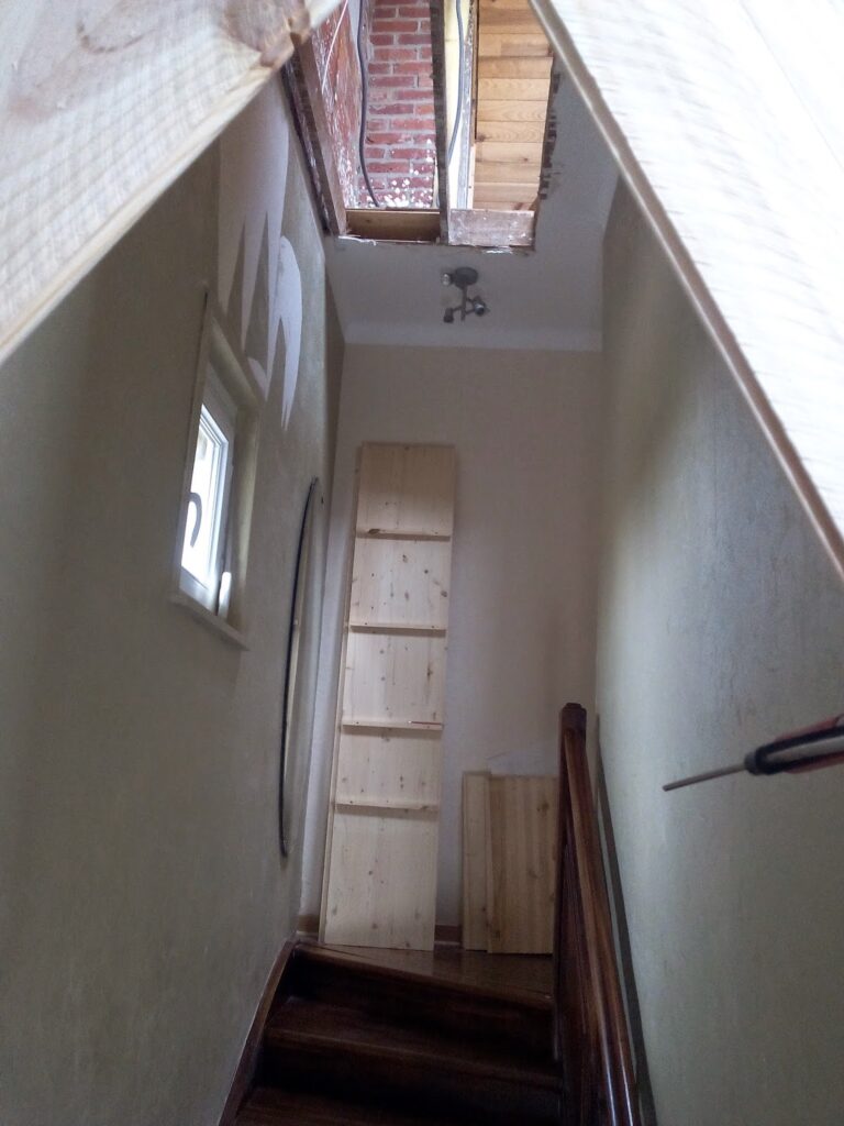 reste a faire : les raccords de plâtre au plafond, le garde fou en haut, la rampe, vernir, refaire l’isolation du pignon au grenier etc….