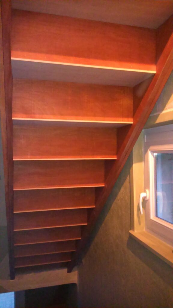Il a fallu réaliser la crémaillère a la scie a onglets. Puis coller les deux épaisseurs l’une a l’autre. Idem de l’autre côté, en miroir. Je n’ai pas de photo des limons pendant la fabrication, mais j’en ai prêts à être hissés par la fenêtre :
