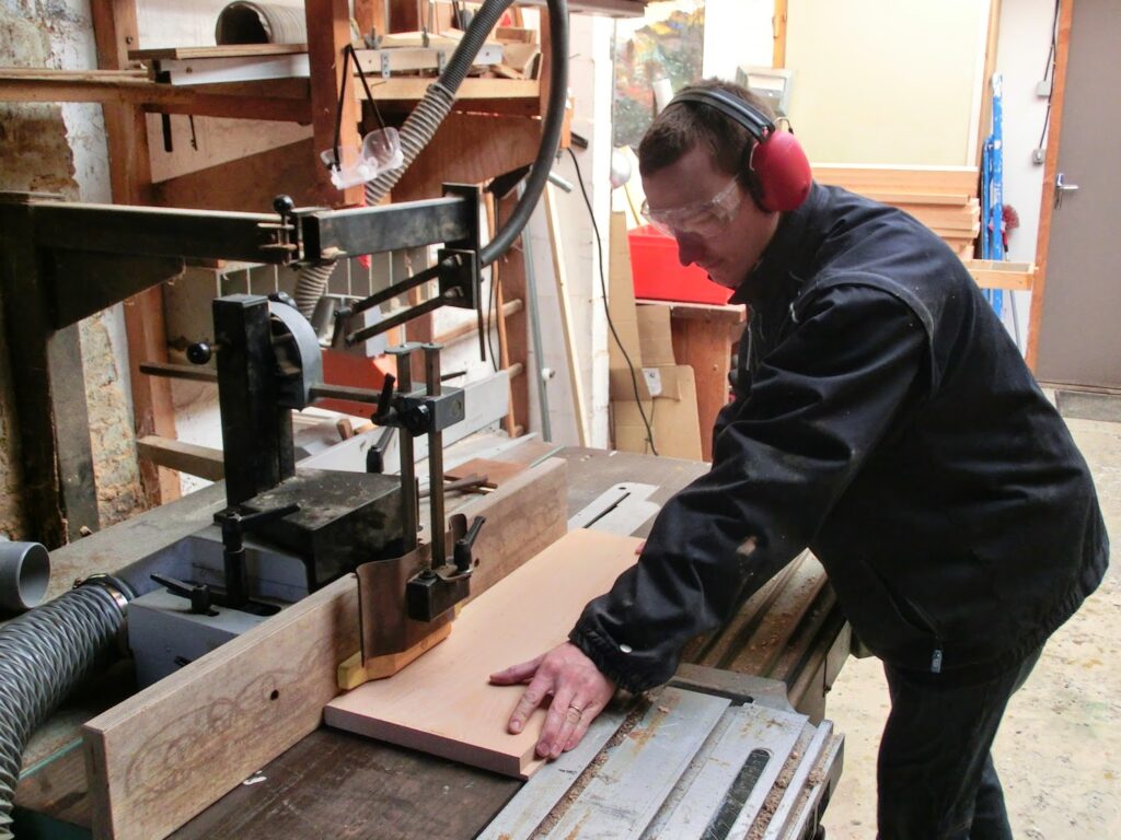D’abord il faut préparer les marches, en hêtre en réalisant une feuillure d’un côté et une rainure de l’autre pour insérer la contre marche.