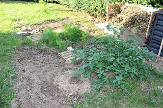 Là où se trouvait les grands sapins, nous avons commencé à dessoucher pour pouvoir faire une rocaille, dur dur les souches de sapins!! il en reste encore 3 à faire…