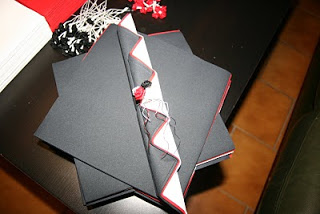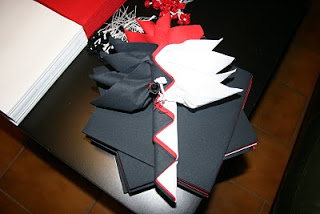 Rouge, noir et blanc (bah oui un peu de blanc tout de même :p) un peu dur à plier d’ailleurs avec 3 serviettes mais j’y suis parvenue à coup de 15 par jour : plus ça commençait à faire mal aux mains…