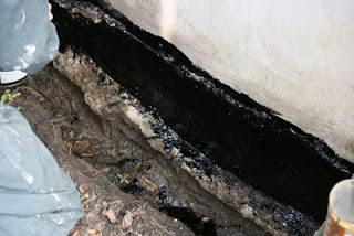 D’abord occupons nous de la buanderie. Le soucis venait du mur extérieur pas assez étanche et de l’eau stagnante à cet endroit lors de grosses pluies… Pour réparer cette imperfection, quelques coups de pelles, du goudron, du balatum (et oui), un tuyau de gouttière troué (et oui aussi), et des cailloux 😀