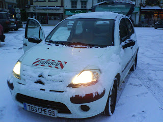 Enfin, j’avais hâte. On m’envoie en Normandie faire un relevé en urgence top urgente. Pour planter le décor, une photo satellite de L’Aigle : C’est pas nos bonnes vieilles métropoles !! Une ville entourée de champs à perte de vue, et pas déneigée. Premier jour : on part (en retard) on se paye la tempête de neige dont on parlait tant a la radio…