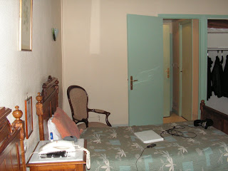 On change d’hôtel, on se retrouve dans le centre ( hourrah ! ) dans un hôtel ** tout vieux sans douche, avec vue sur la place principale (de jour comme de nuit d’ailleurs vu que les rideaux n’occultent rien du tout …) avec un plancher qui grince à mort et une isolation acoustique faite à la feuille d’OCB. (ah et aussi, on a Internet : mais il faut acheter un forfait carte de 10Heures … c’est la boîte qui paye ! Mais faudrait pas abuser quoi…)