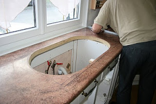Pour cela il a fallu enlever l’ancien (pour rappel il n’y avait qu’un seul bac et qui plus est rond…) et couper le plan de travail à la scie sauteuse… paix à l’âme de la scie de papa JJ 🙁