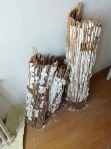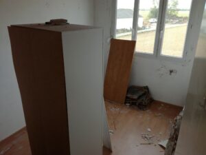 Un peu de ménage, on débarrasse ce qu’on peut, et a coup de masse et de scie … N’a plus de plafond !!