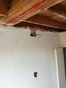 Alors, on va refaire la tapisserie. OK. J’arrache la tapisserie. Maintenant, on va essayer un truc : pourquoi ne pas mettre une lumière au plafond, car il n’y en a pas, il n’y a que deux petites appliques anémiques au mur. Alors, on fait un petit trou dans le mur, pour faire remonter le fil d’alimentation des appliques et nous voila avec un fil qui pendouille au niveau du plafond … Allez, c’est parti, on va faire peter ce foutu plafond en platre et le refaire en bon vieux placo !