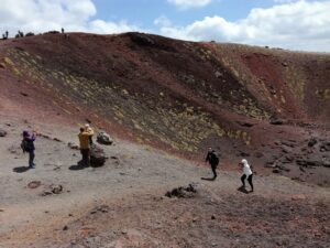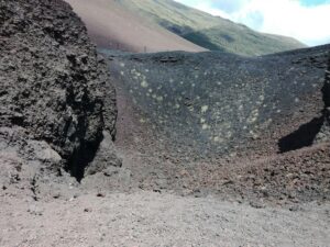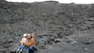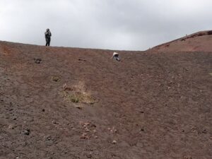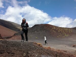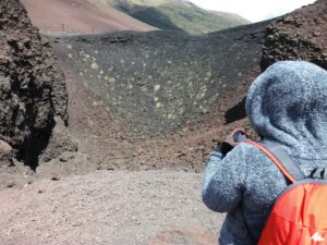 Retour au parking, nous faisons le tour d’un ancien cratère du volcan, le cratère Sylvestre, avec Maxine, qui s’en donne a cœur joie, un très beau spectacle assez déroutant, car il n’y a presque pas de végétation, tout est recouvert de pierre volcanique, c’est très sec et le bruit presque métallique qu’on fait en marchant là dedans est vraiment spécifique.
