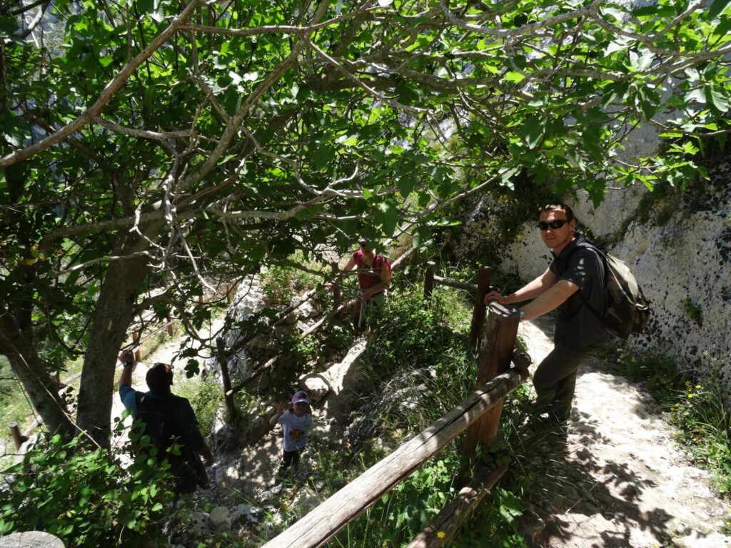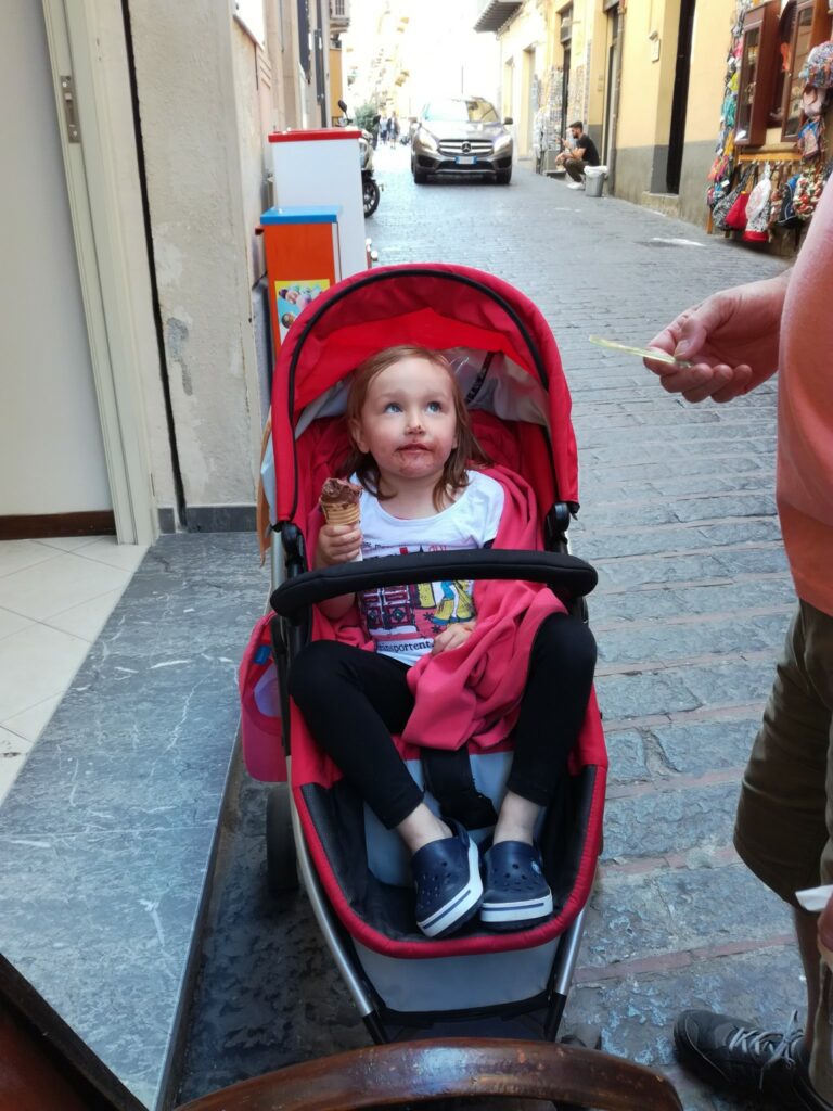 Vous voulez savoir qui a gagné la course? Maxine, évidemment, qui a pratiquement tout remonté seule, peut être 100 ou 200 mètres sur mes épaules, et le reste à pieds, et au pas de charge! Suivi de près par papa, puis papy et enfin mamie et maman, qu’il a fallu ranimer à l’arrivée. Heureusement que les siciliens savent recevoir, il y avait un bar prêt à nous désoiffer juste en haut!