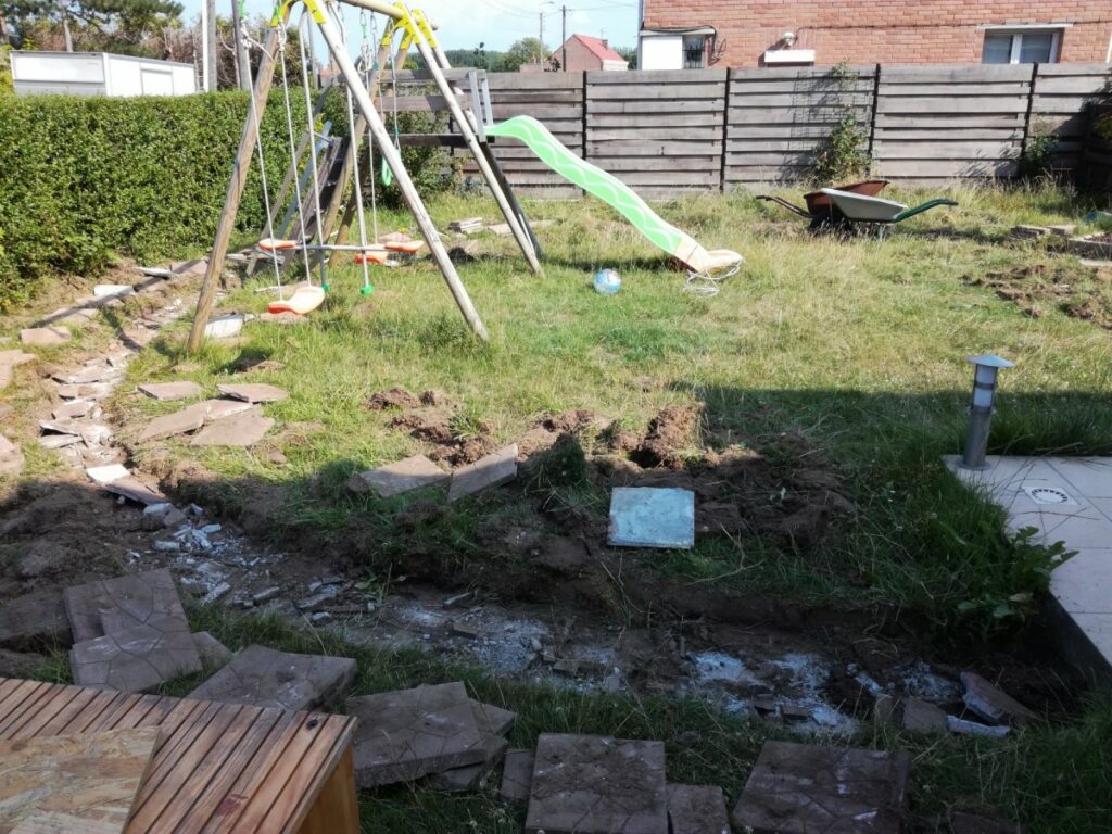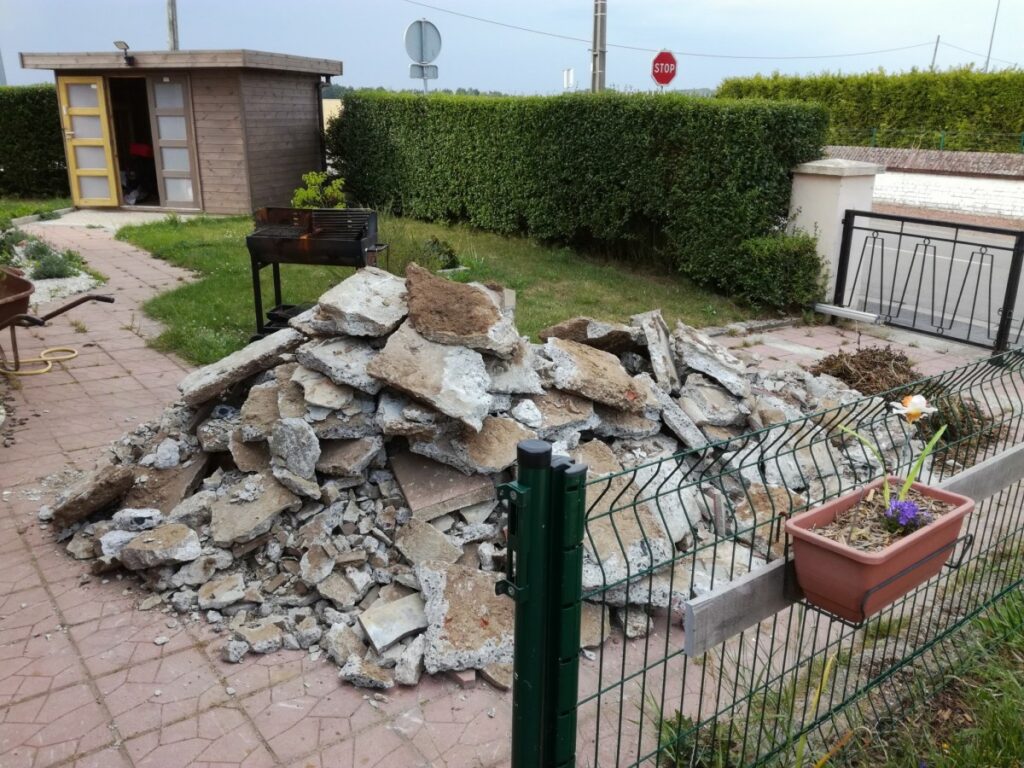 Cette fois, avec Thomas, on a fait sauter toutes les dalles qu’avaient mises l’ancien propriétaire, et j’ai fini de tout évacuer mi aout (10 remorques de gravats …) Encore merci a toi Thomas !