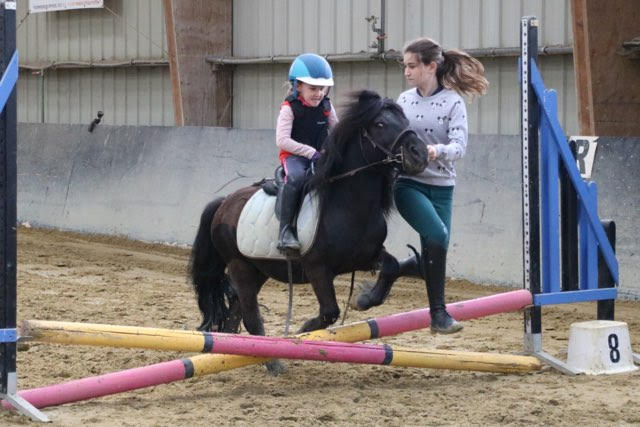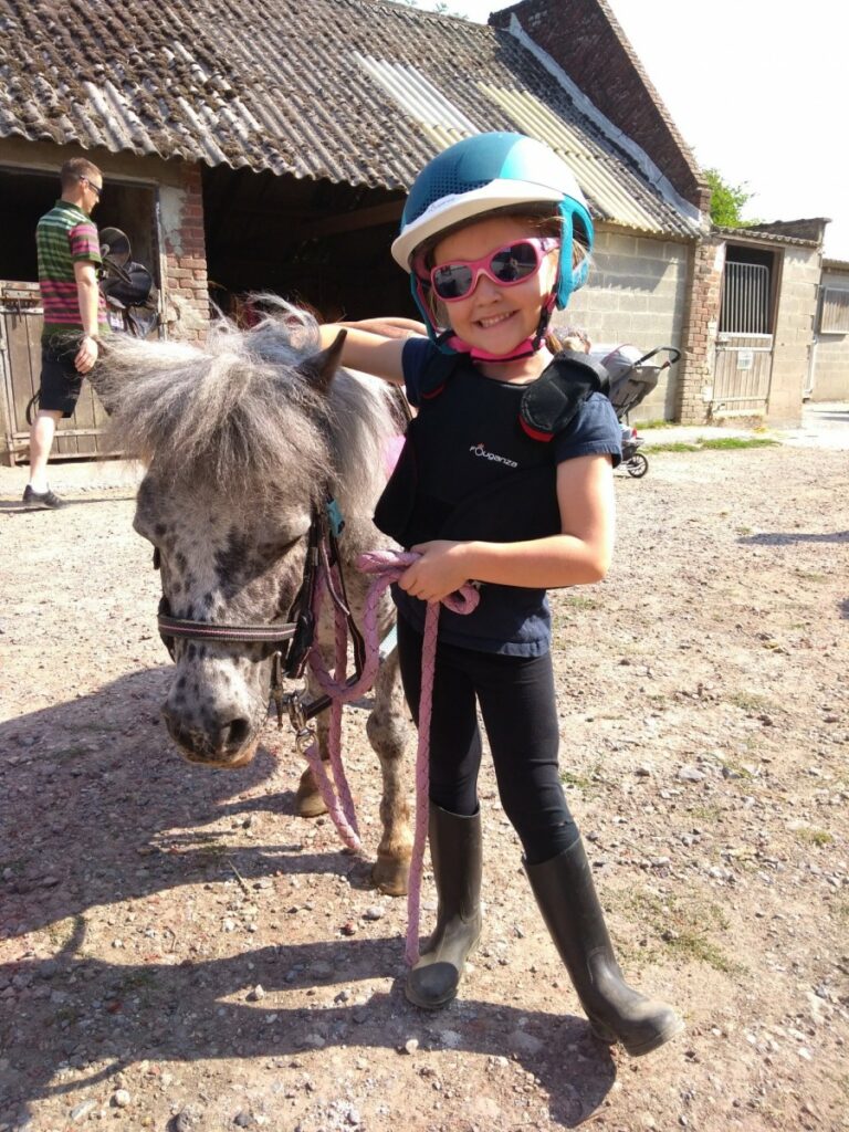 Elle aime toujours autant le poney, elle sait maintenant galoper et sauter une barre de 30 cm