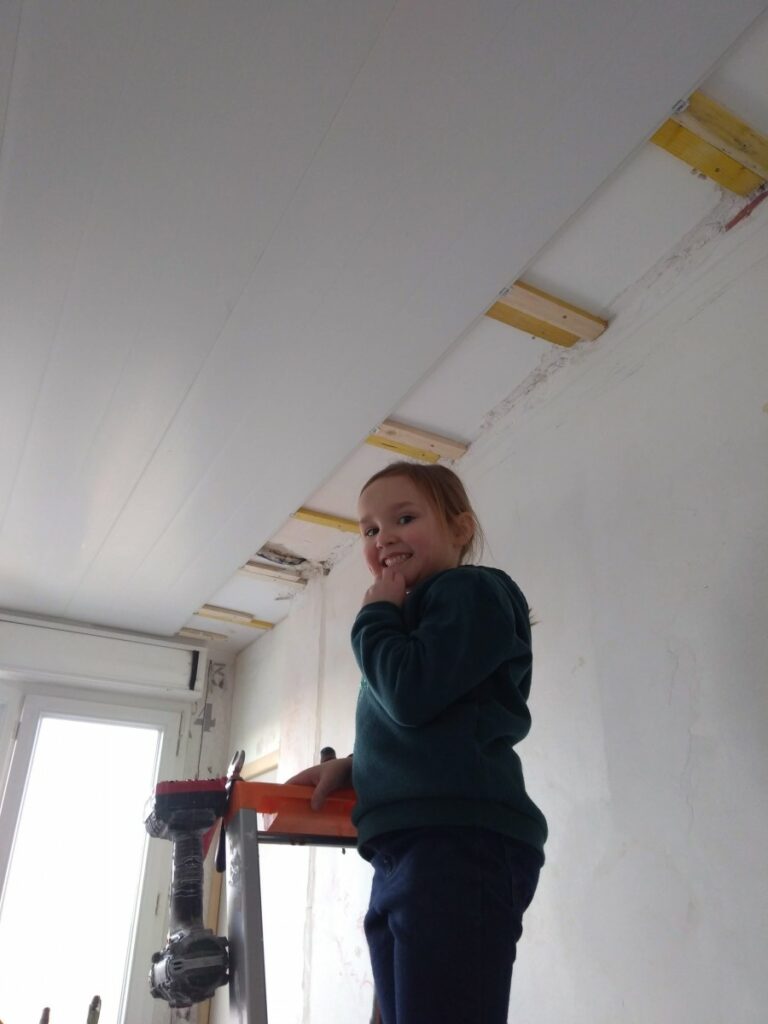 Tout d’abord avec la fin des travaux du salon, la construction de sa cabane extérieure (celle qu’elle a eu pour son anniversaire des 5 ans), les travaux dans le bureau afin d’accueillir Alexine dans la pièce musique d’Aymeric.