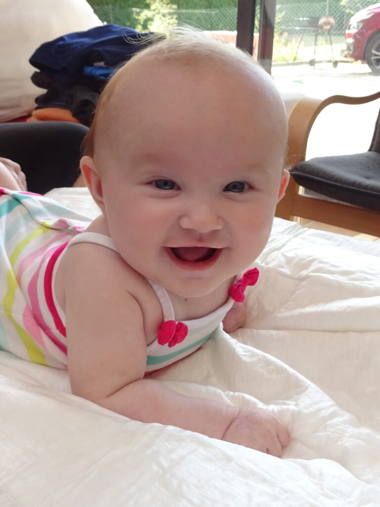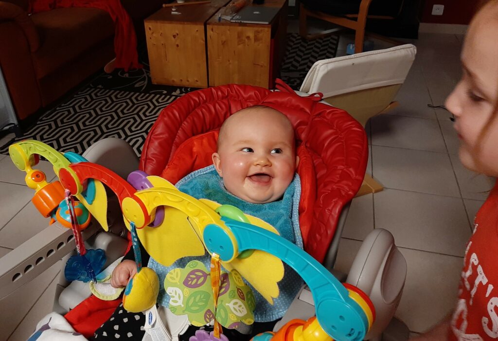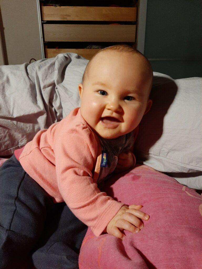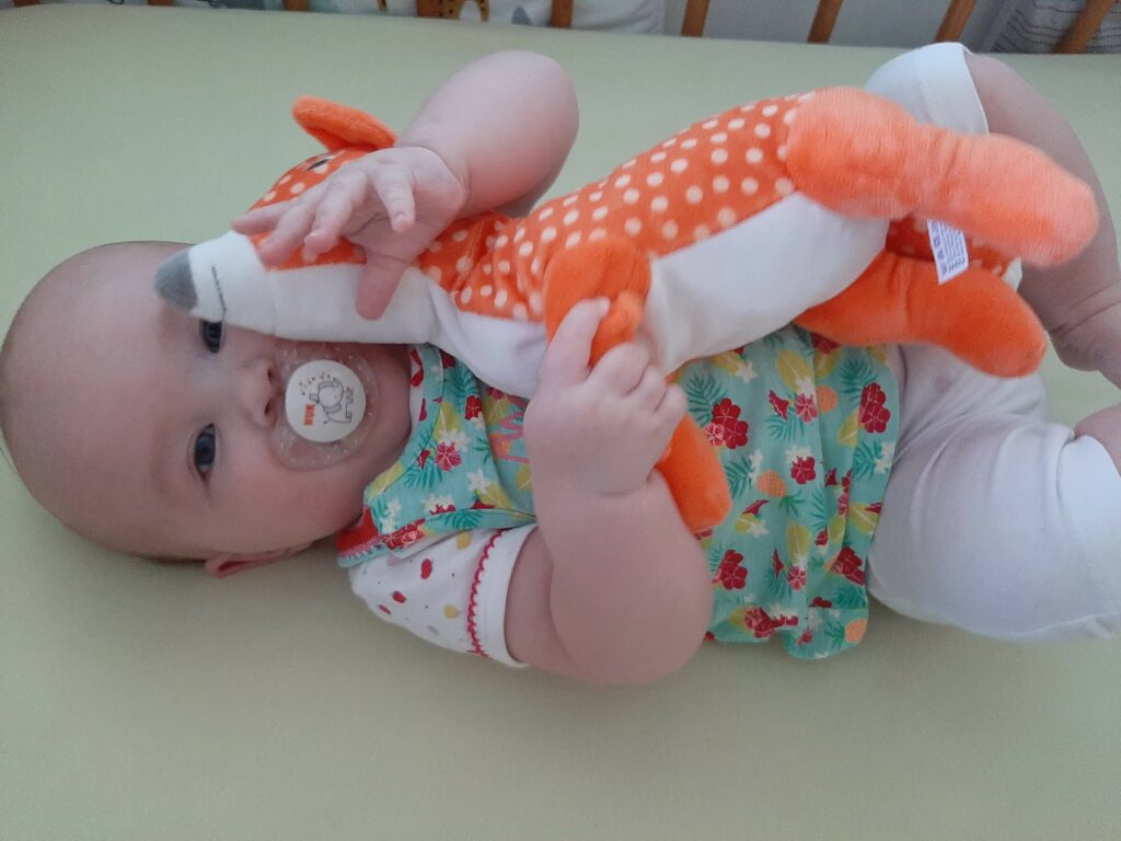 Elle commence à bien interagir avec nous, elle a des fous rires quand Maxine fait le clown ou quand on la chatouille, elle reste très complice avec sa grande soeur
