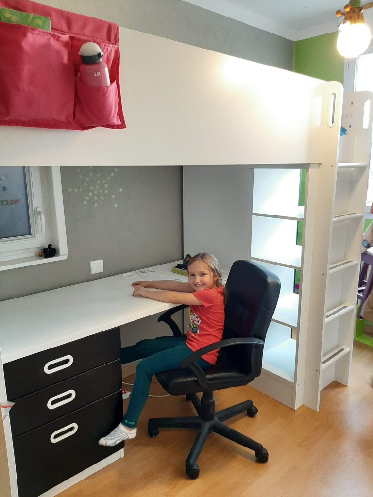 Du coup comme c’est maintenant une grande, elle a droit à un bureau dans sa chambre, mais la chambre n’était pas non plus très grande, nous avons opté pour un lit mezzanine.