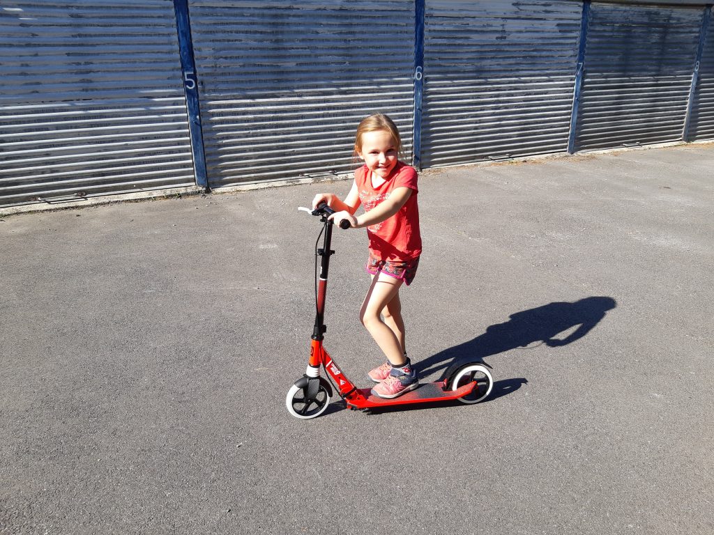 Le vélo n’est pas trop son truc… elle a peur de tomber sur la route (sûrement un lien avec ma propre chute de l’année dernière…), mais par contre elle maitrise la trottinette avec laquelle elle va à l’école presque tous les jours.