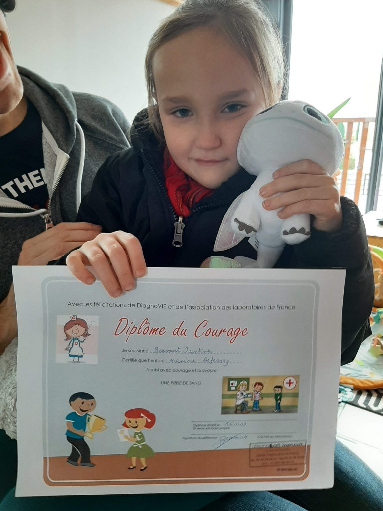 Sinon elle a été bien malade au mois de novembre dernier, une belle infection urinaire qui est remontée jusqu’au rein, ce qui lui a valu le droit de faire sa première prise de sang… c’était pas trop une réussite, la nana ne trouvait pas sa veine et n’était pas très douce avec elle 🙁 Elle a demandé de l’aide à une de ses collègues avec qui ça s’est beaucoup mieux passé. Pour une première expérience, c’était franchement pas terrible… Mais elle a eu droit à un diplôme du courage de la part du labo pour avoir passé cette dure épreuve (et un petit cadeau de maman).