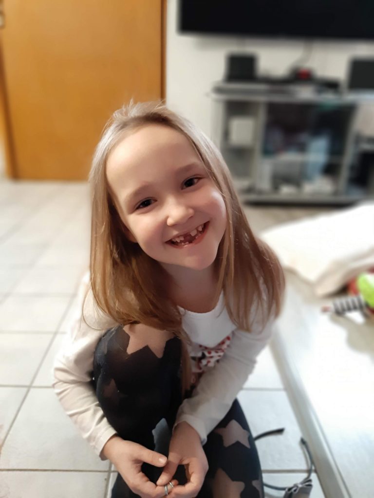 Elle a aussi commencé à perdre ses dents de lait, heureusement les dents définitives n’étaient pas loin, elle n’est pas restée avec des trous très longtemps 😉