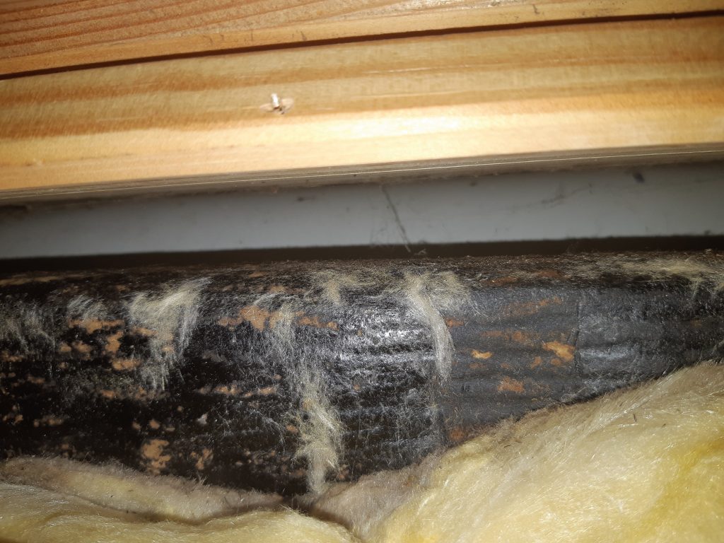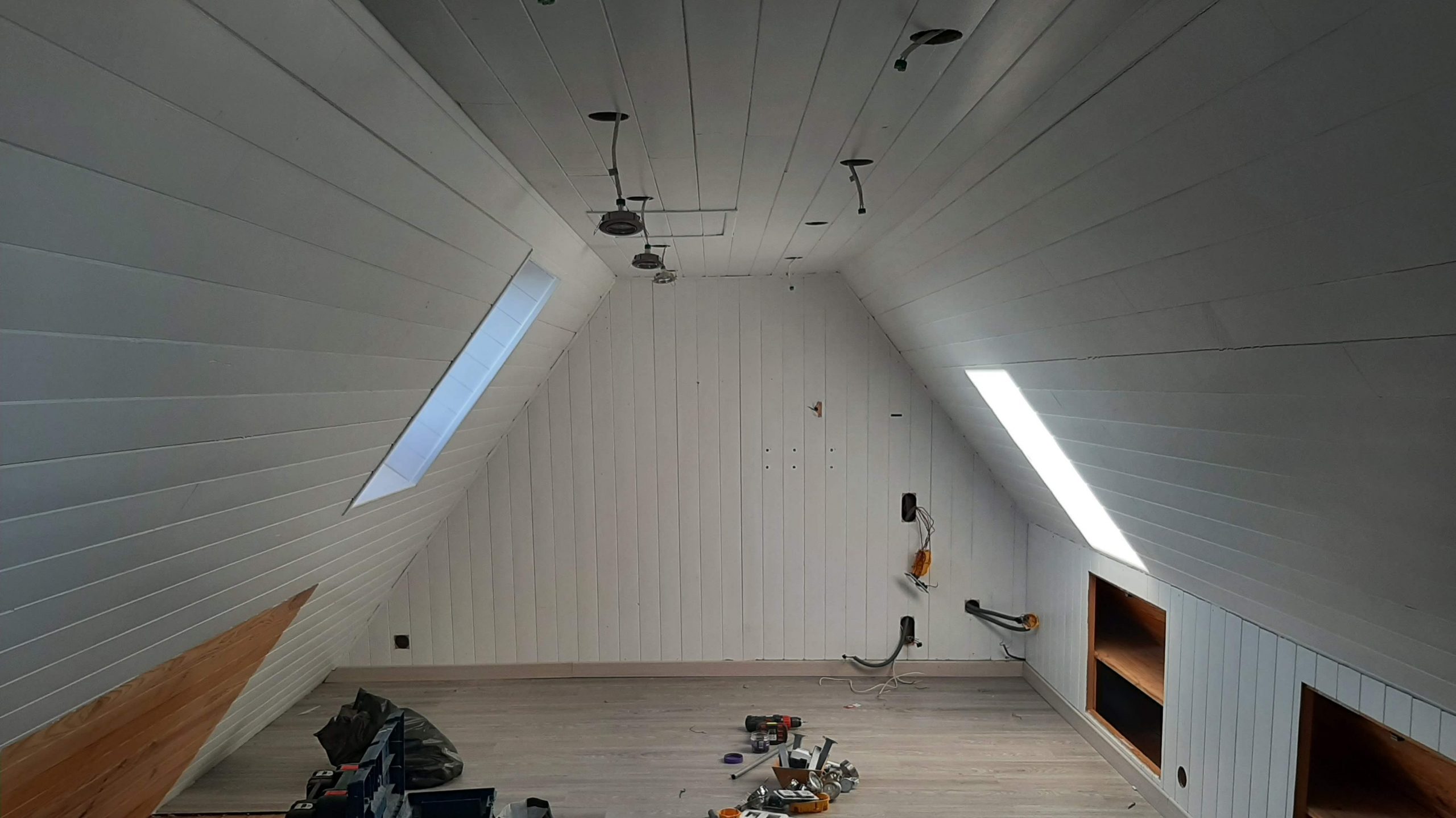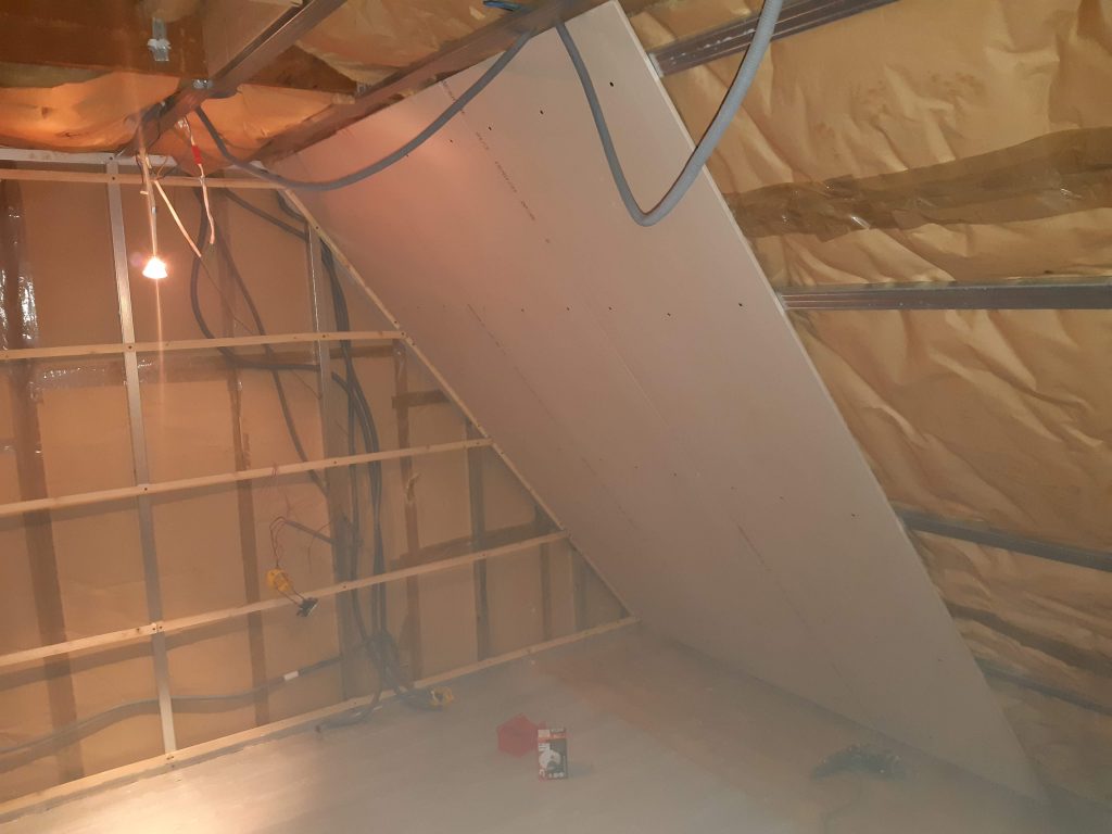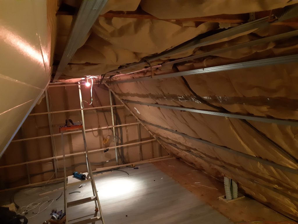 Il y avait des rails déjà, donc, vraiment, je ne comprends pas pourquoi l’ancien propriétaire a mis du lambris, plein de nœuds et de trous, plutôt qu’un placo ? Ça va plus vite à monter au dernier étage, plus rapide à installer, pas de finition, pas d’enduit, de ponçage, de peinture… Bon, ok, j’ai compris pourquoi.
