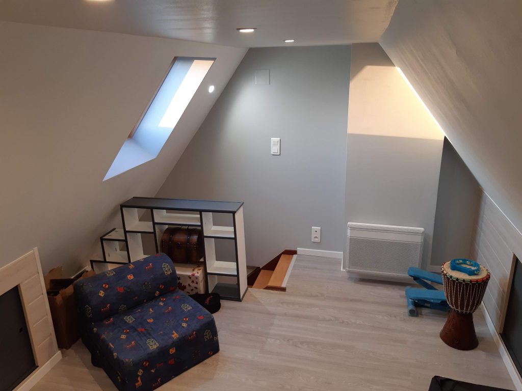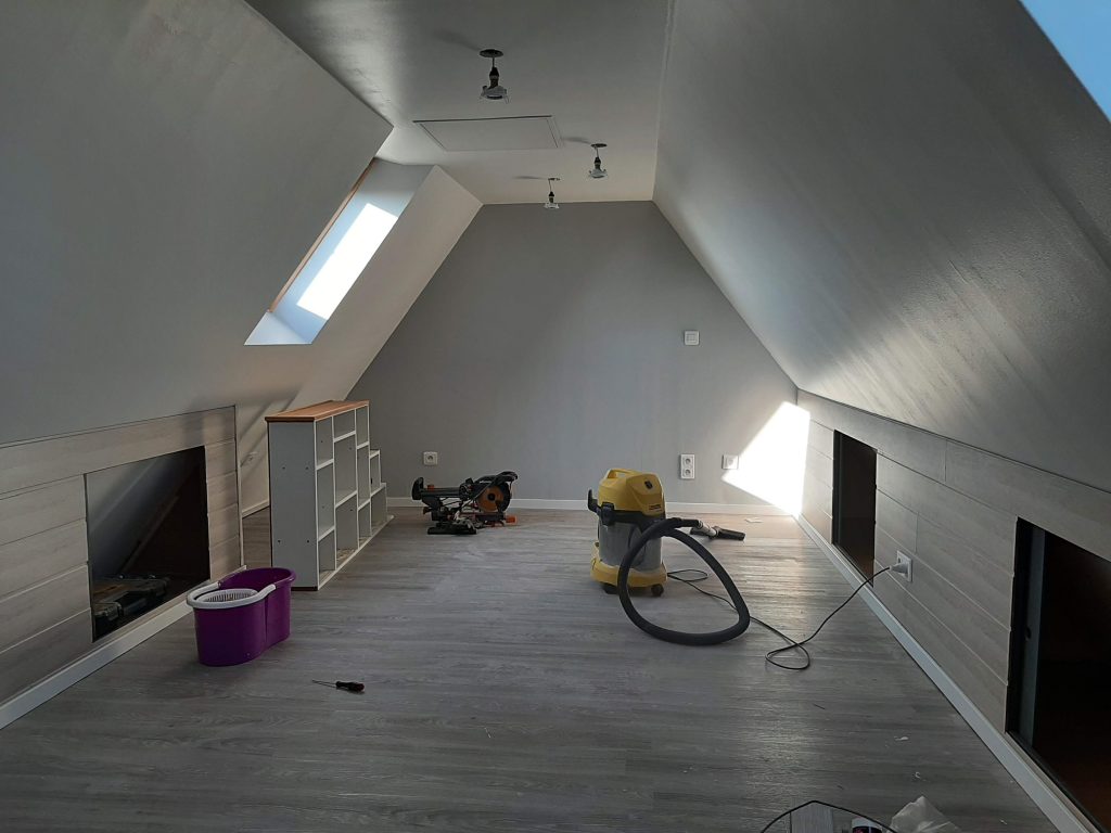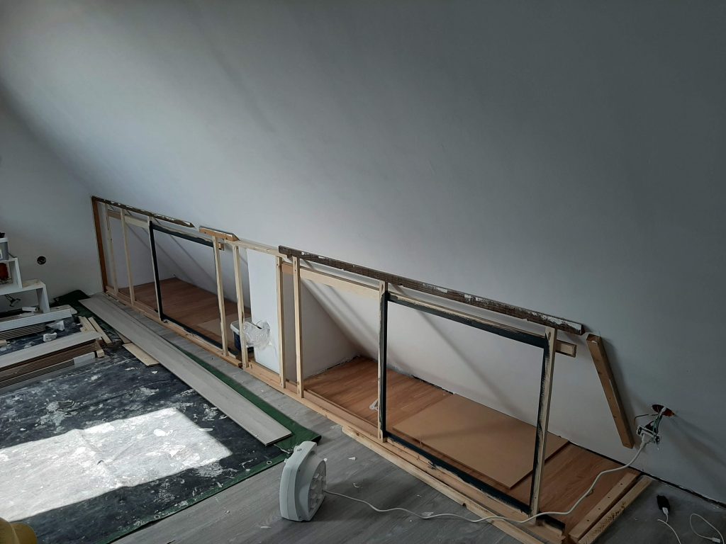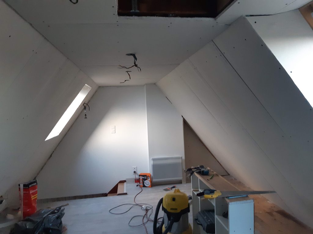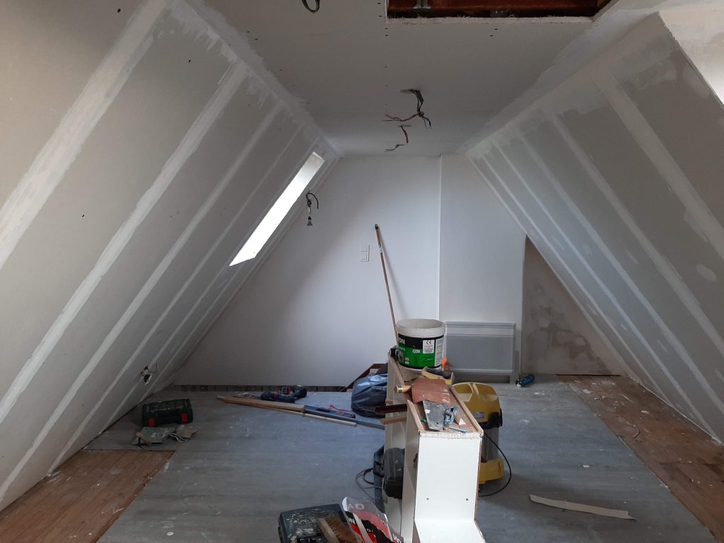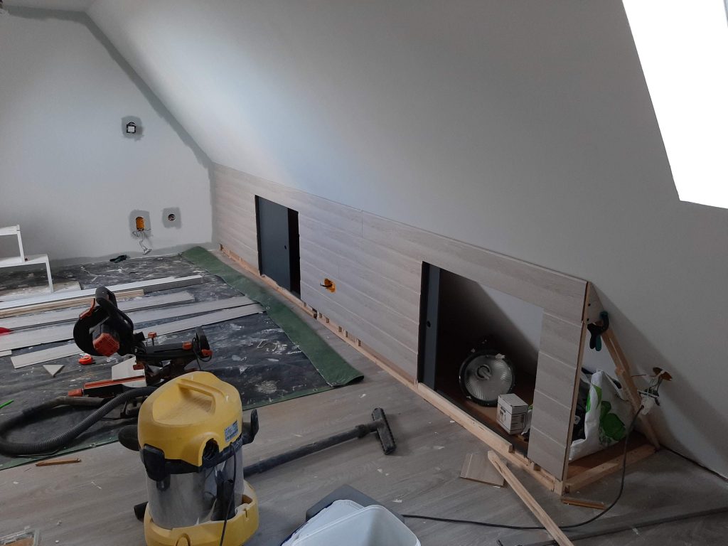 Les finitions, c’est vraiment ce qu’il y a de plus long. Finalement, tout cela aura duré un bon mois. Les placards sous rampants, c’était pénible, pas très long, mais pénible. Avec un niveau laser, ceci dit, ça aide bien.