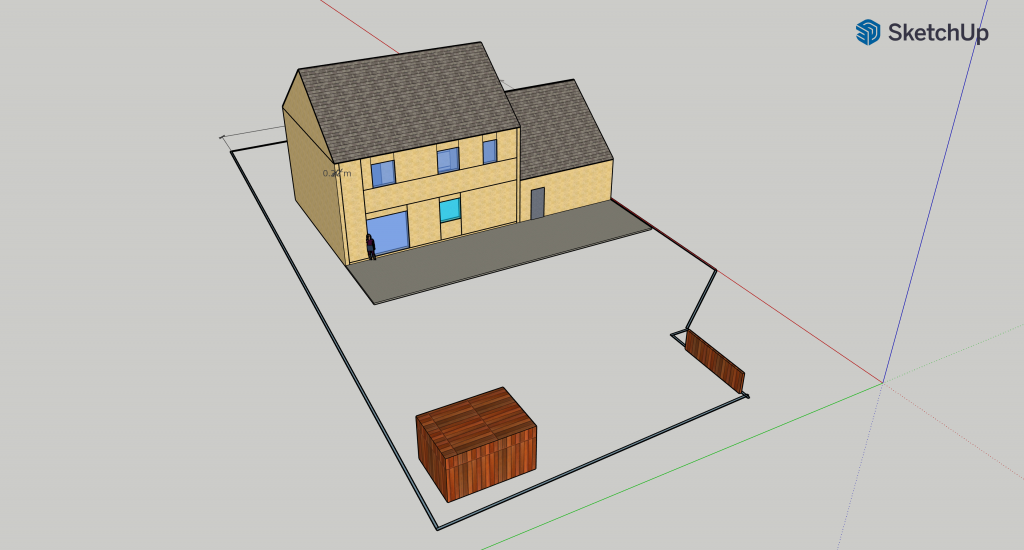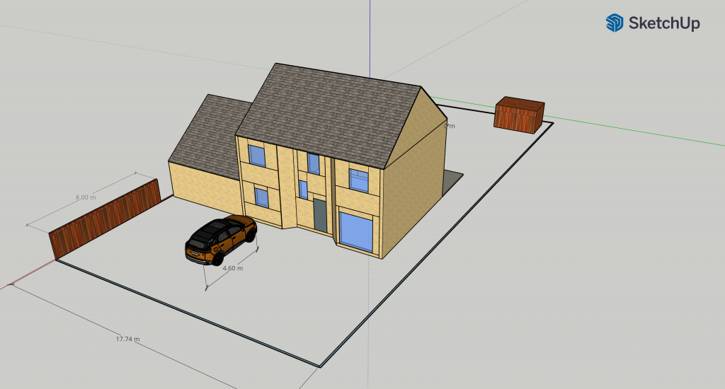 Allez, quelques photos des plans et notre simulation, afin de se faire une idée des volumes. On a pas mal de place en façade, pour entrer les voitures, manœuvrer, pour le recul du portail coulissant, et peut-être installer un carport, ou quelque chose comme ça. Au niveau du jardin, on envisage une grande terrasse, genre 4M de profond environ, et il reste encore bien assez de pelouse, suffisamment à tondre en tout cas ! J’ai mis un abri de jardin dans le fond, pour l’échelle