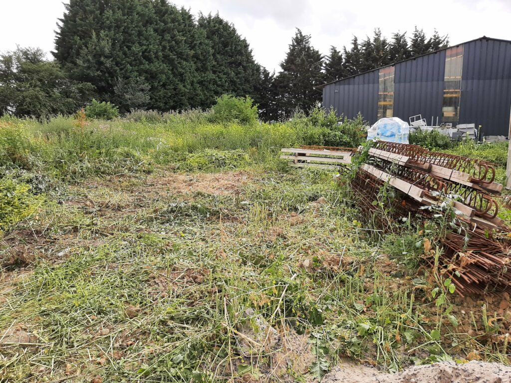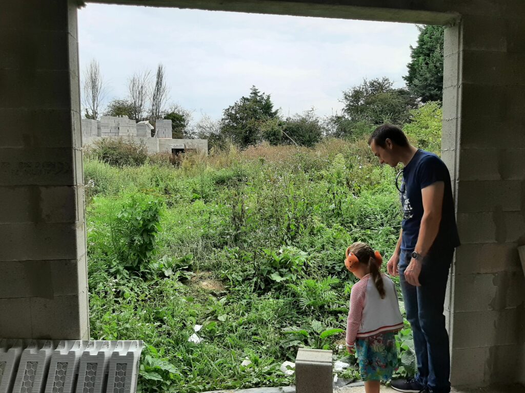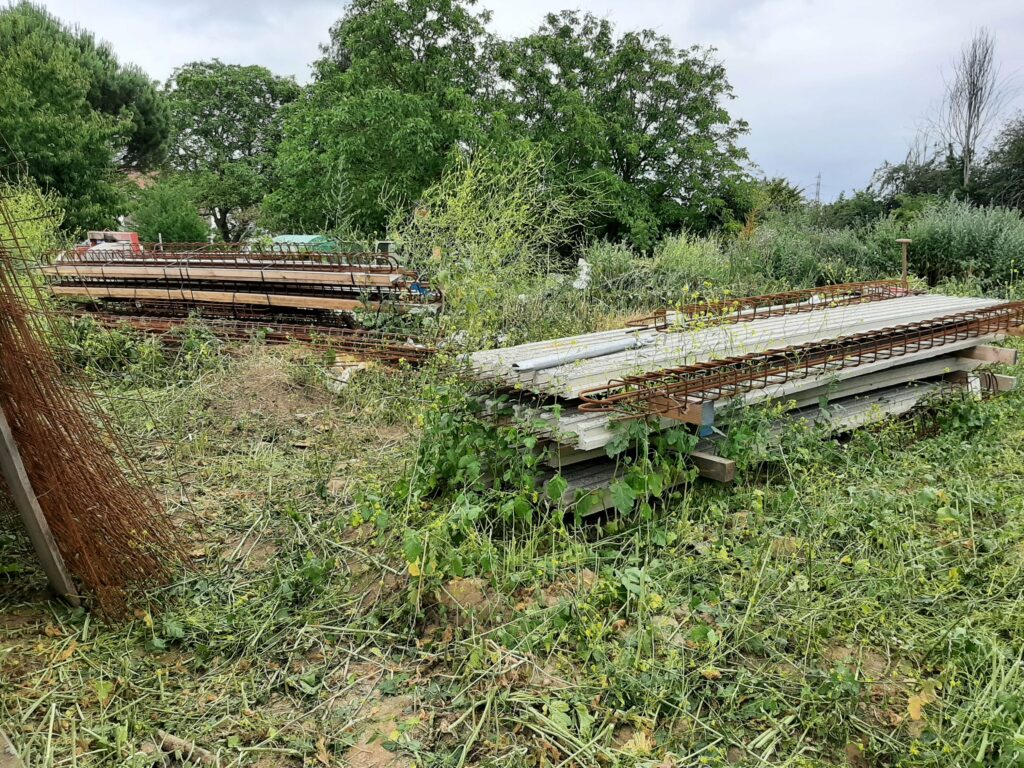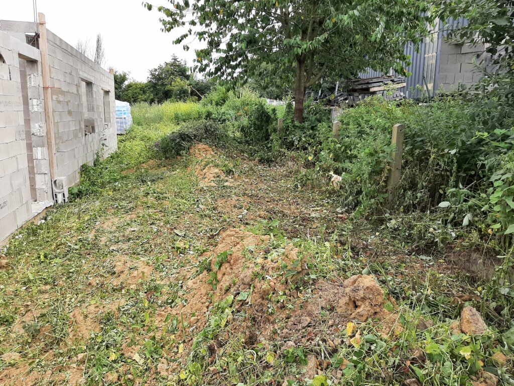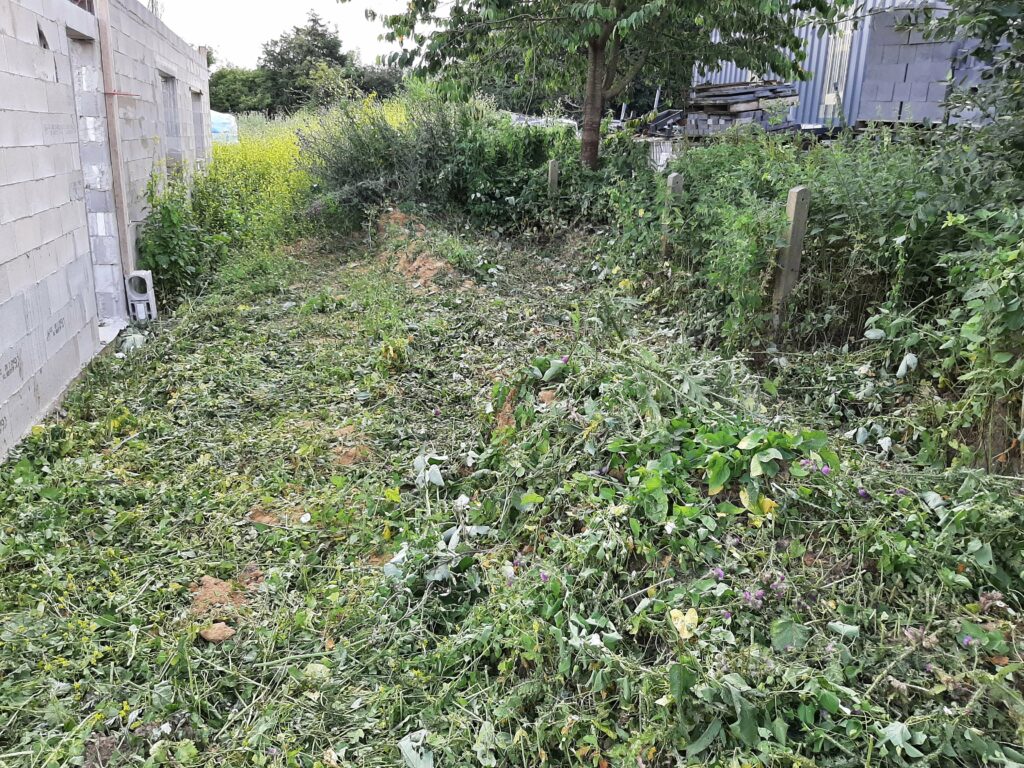 Entre temps, la végétation, elle, n’attend pas. Le conducteur de travaux nous a donc demandé de faire un peu de ménage autour du chantier. En effet, on peut voir plus haut que les matériaux ont été entreposés sur notre terrain (même les matériaux de notre voisin) et deviennent difficiles d’accès. Nous avons donc investi dans un débroussailleur thermique et joué avec pendant une journée. Au final, nous avons dégagé les treillis soudés, les poutrelles de l’étage, les armatures…