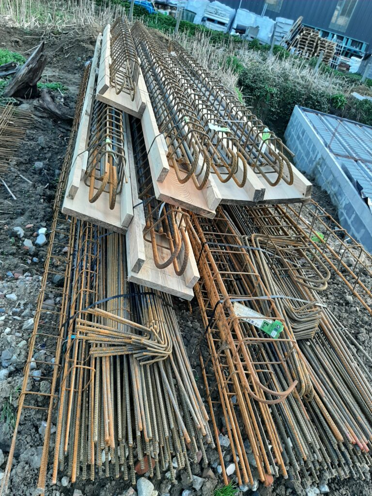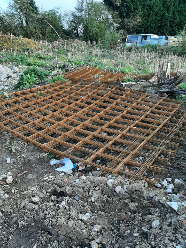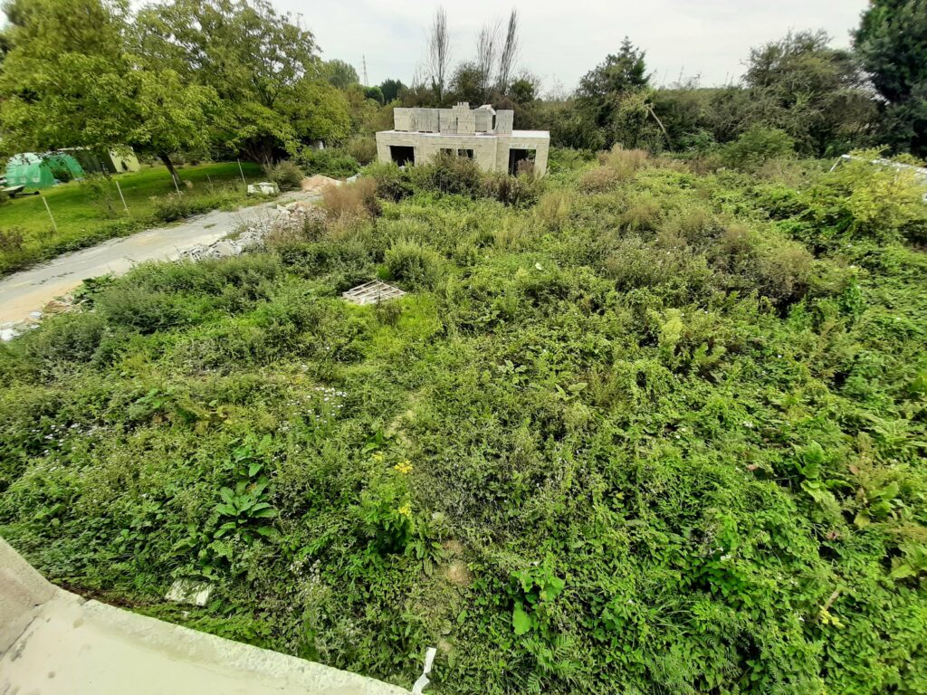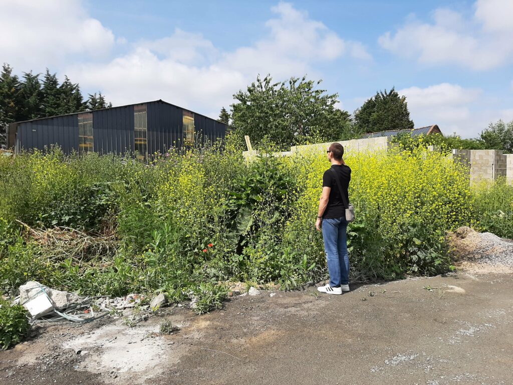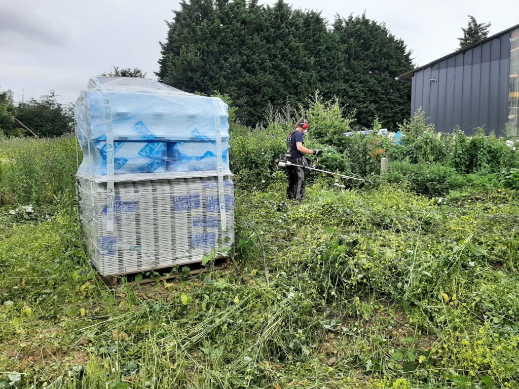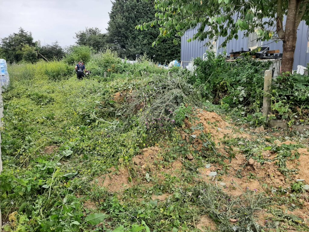 Entre temps, la végétation, elle, n’attend pas. Le conducteur de travaux nous a donc demandé de faire un peu de ménage autour du chantier. En effet, on peut voir plus haut que les matériaux ont été entreposés sur notre terrain (même les matériaux de notre voisin) et deviennent difficiles d’accès. Nous avons donc investi dans un débroussailleur thermique et joué avec pendant une journée. Au final, nous avons dégagé les treillis soudés, les poutrelles de l’étage, les armatures…