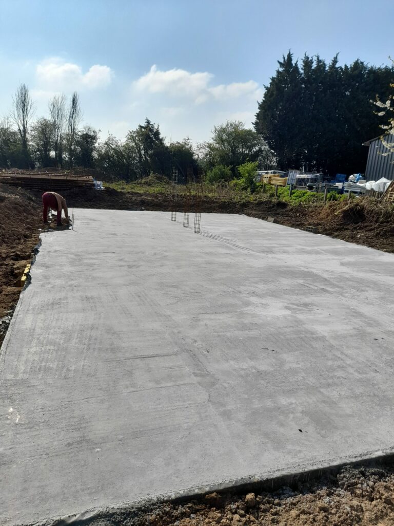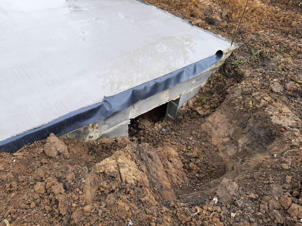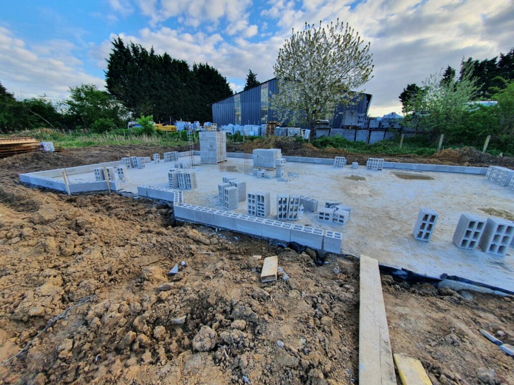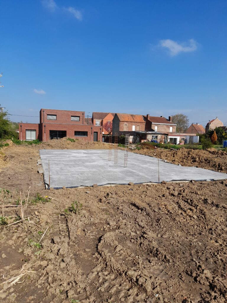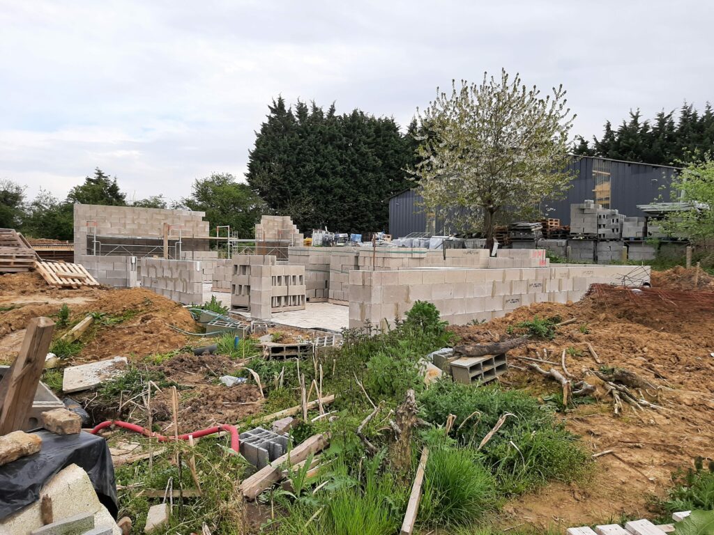 Pendant nos vacances d’avril, il y a eu du mouvement sur le terrain. Nos voisins nous ont envoyé des photos : les maçons sont venus couler la dalle, et ça fait du bien ! Enfin le chantier reprend après bientôt 6 mois d’arrêt. Le trou autour des fondations a été rebouché, sans poser le « DeltaMS » qui nous avait été chiffré par la société ALFRAN, mais non réalisé, car ils ont fait faillite. On parle d’une membrane qu’on pose le long des fondations pour protéger les maçonneries de l’humidité. On en parle un peu autour de nous, c’est finalement au mieux inutile, car on parle d’un vide sanitaire, qui est pensé pour respirer, pas d’une cave ou d’un sous-sol habitable. Étant donné que cela fait partie des travaux que l’on a pris à notre charge, on a décidé de ne pas le poser, en accord avec tout le monde… Et même avec notre conducteur de travaux.