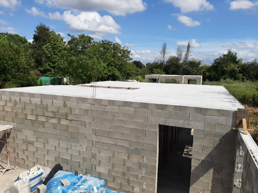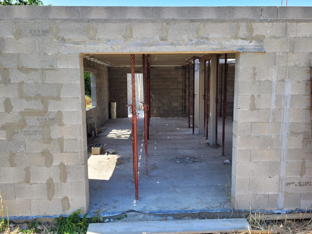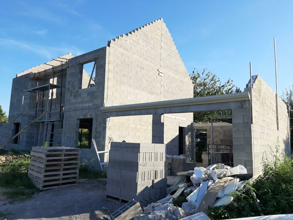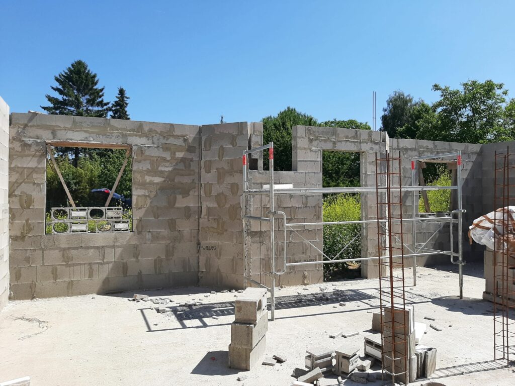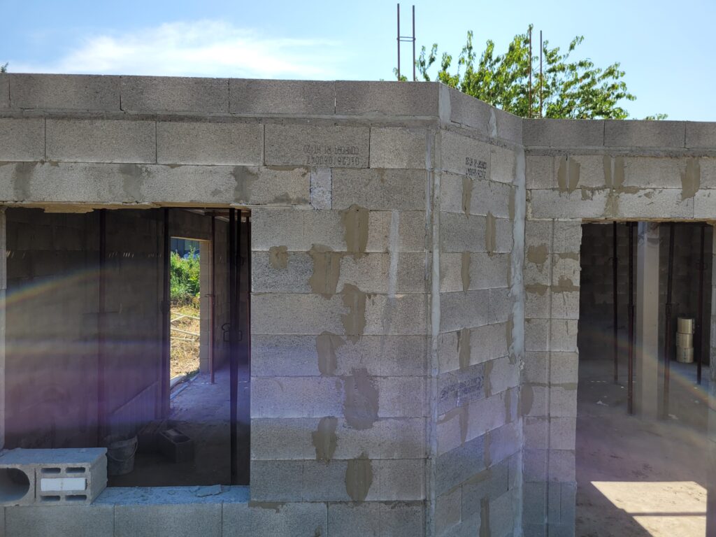 La dalle est coulée en Avril, mais nous n’avons pas trop d’avancée avant juin/juillet : En fait, le maçon a préféré attendre les paiements avant de continuer les chantiers, ayant été refroidis par son expérience avec la société Seissigma. Le temps que le paiement pour la dalle soit fait, il avait avancé sur d’autres chantiers, naturellement, et n’a pu reprendre notre dossier que quelques semaines plus tard. Donc, les élévations (comprendre : les murs) commencent, et c’est un beau morceau ! On voit la maison se dessiner, c’est plaisant. Nous avons tout de même quelques interrogations quant aux techniques employées (notamment les alignements de parpaings qui font apparaitre des ‘coups de sabre’ : normalement les parpaings doivent être posés en quinconce, mais au niveau de l’entrée de la maison, ce n’est pas le cas, ils sont juste empilés.), et globalement ça va, sur certains points on est pas a 100% dans le respect des règles de l’art, mais ce qui a été fait semble être bon. (dans notre exemple, les maçons posent des aiguilles pour renforcer les liaisons, n’ayant pas la possibilité de couler un poteau pile à l’endroit de la jonction…)