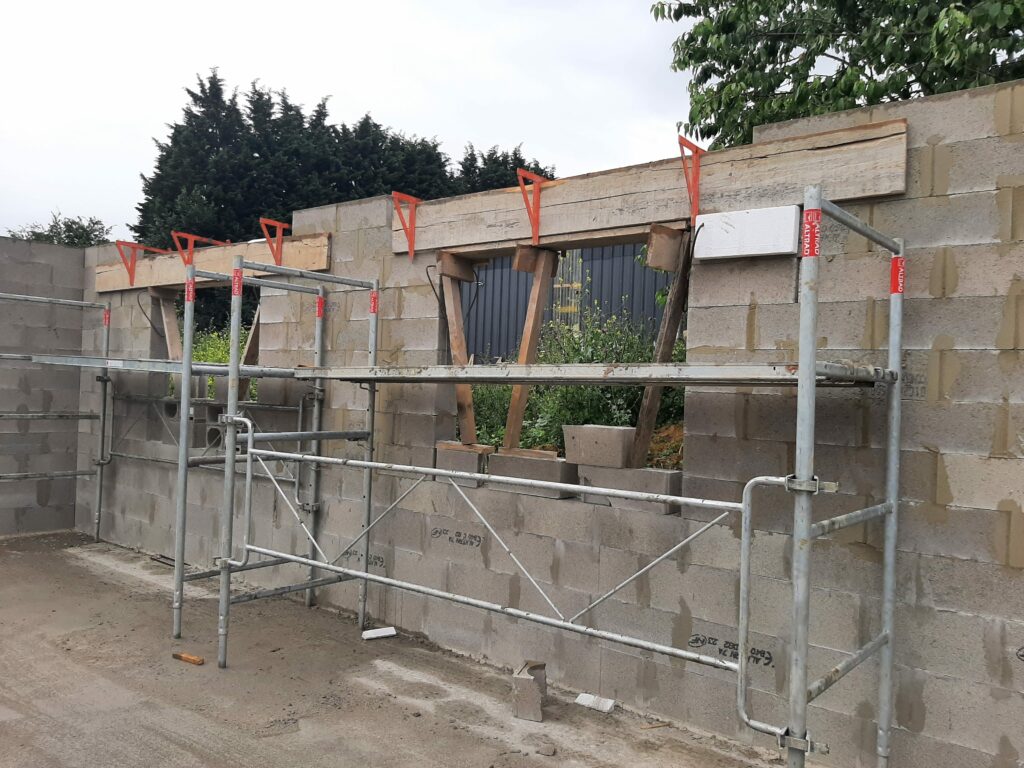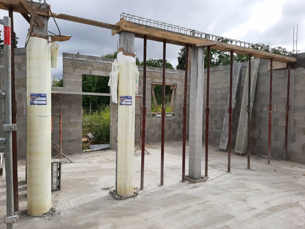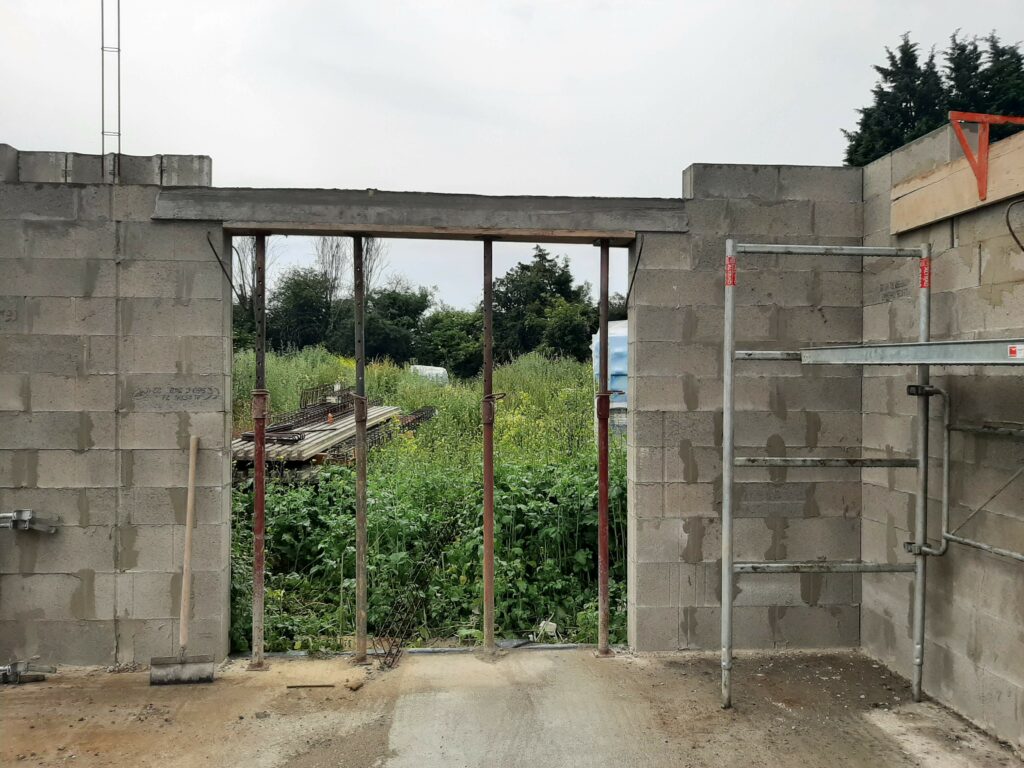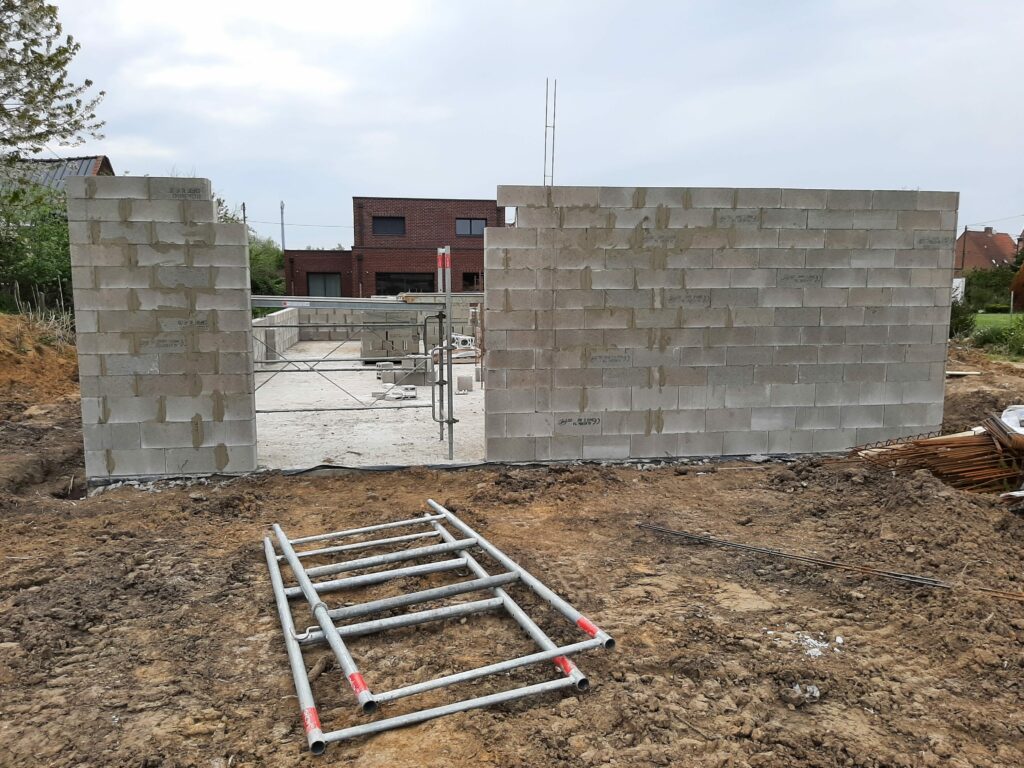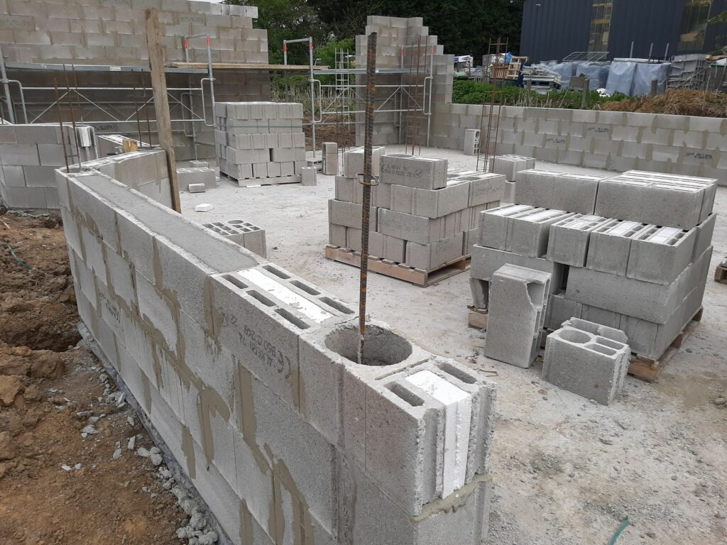 La dalle est coulée en Avril, mais nous n’avons pas trop d’avancée avant juin/juillet : En fait, le maçon a préféré attendre les paiements avant de continuer les chantiers, ayant été refroidis par son expérience avec la société Seissigma. Le temps que le paiement pour la dalle soit fait, il avait avancé sur d’autres chantiers, naturellement, et n’a pu reprendre notre dossier que quelques semaines plus tard. Donc, les élévations (comprendre : les murs) commencent, et c’est un beau morceau ! On voit la maison se dessiner, c’est plaisant. Nous avons tout de même quelques interrogations quant aux techniques employées (notamment les alignements de parpaings qui font apparaitre des ‘coups de sabre’ : normalement les parpaings doivent être posés en quinconce, mais au niveau de l’entrée de la maison, ce n’est pas le cas, ils sont juste empilés.), et globalement ça va, sur certains points on est pas a 100% dans le respect des règles de l’art, mais ce qui a été fait semble être bon. (dans notre exemple, les maçons posent des aiguilles pour renforcer les liaisons, n’ayant pas la possibilité de couler un poteau pile à l’endroit de la jonction…)