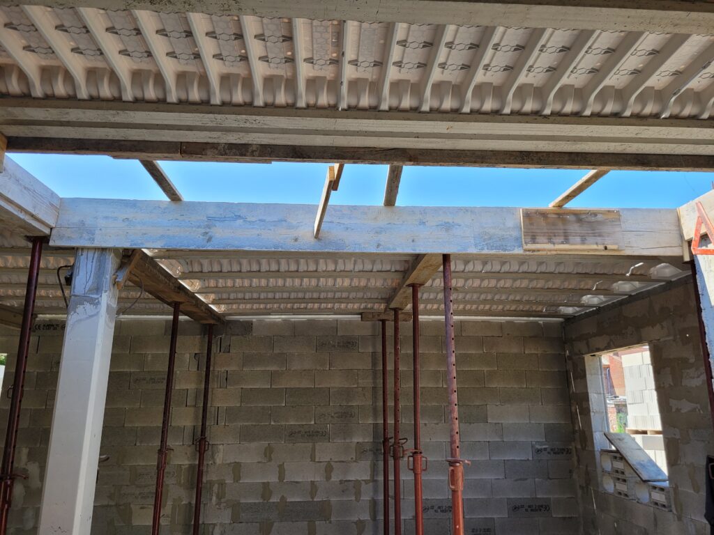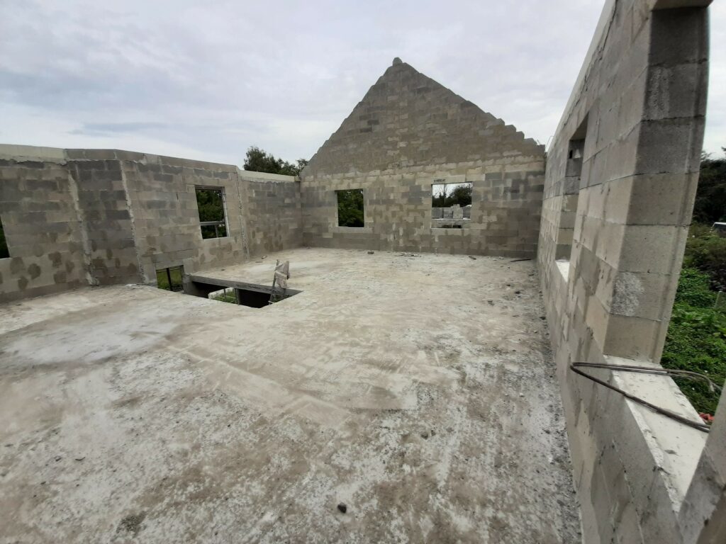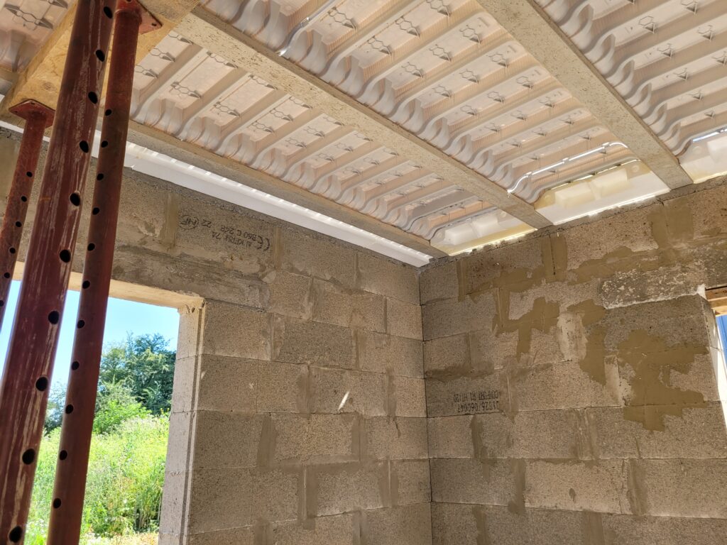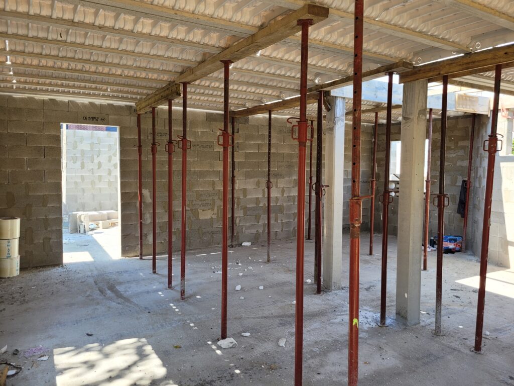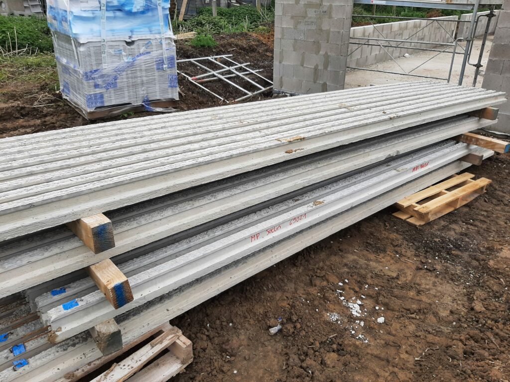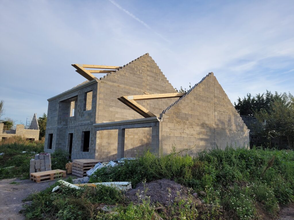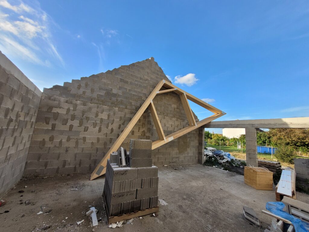 Ca y est, on a une boite qui ferme ! Les armatures pour la dalle de l’étage sont posées, étayéees, et la dalle est finalement coulée en quelques jours. Cela reste également comme ça pendant un certain temps, puis les parpaings sont livrés sur la dalle, et les maçons peuvent terminer les élévations de l’étage et les pignons. Nous avons à présent une bonne idée du volume de notre maison, ça semble gigantesque… Enfin, la charpente est livrée sur place, il n’y a plus qu’à l’installer.