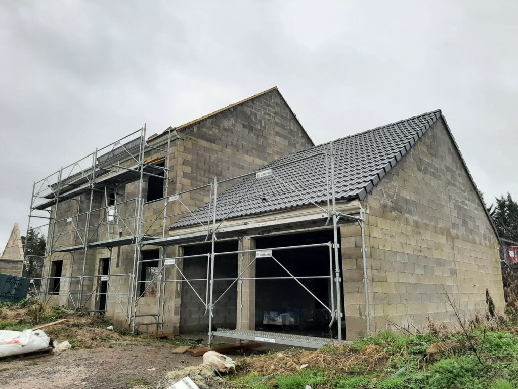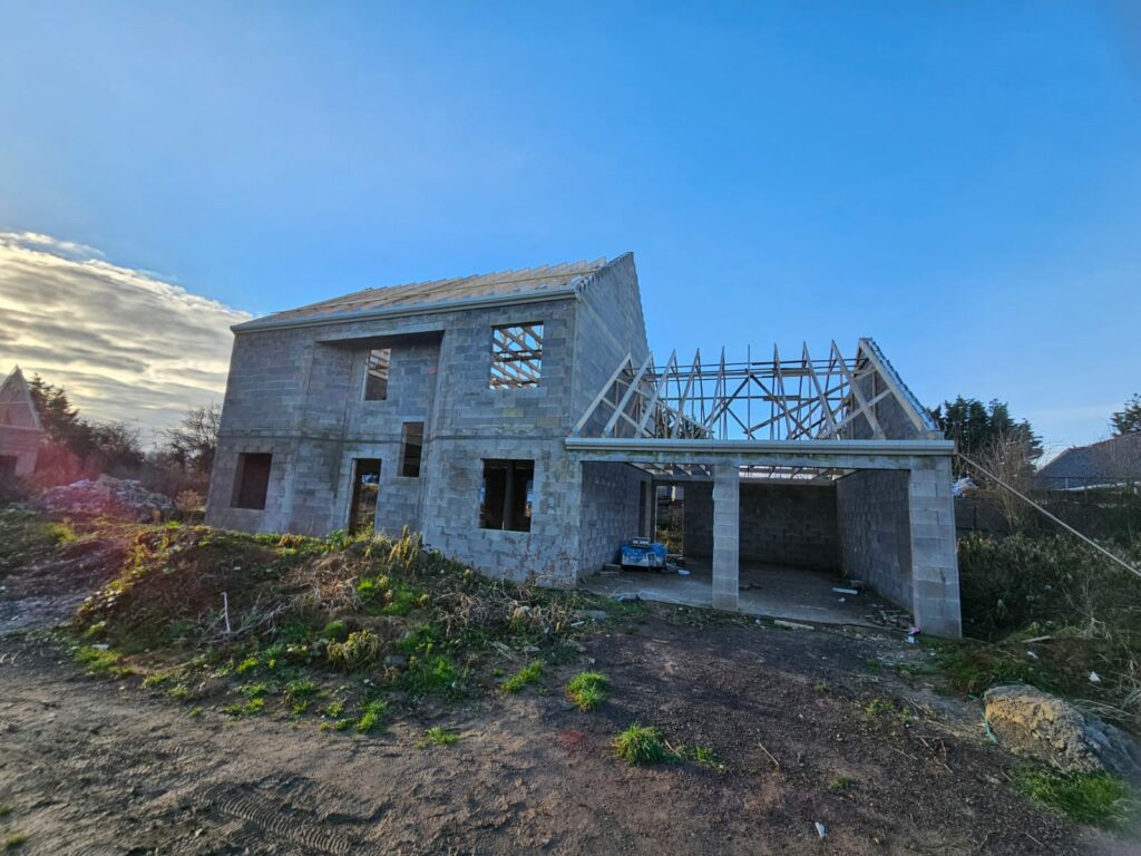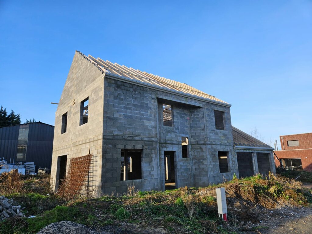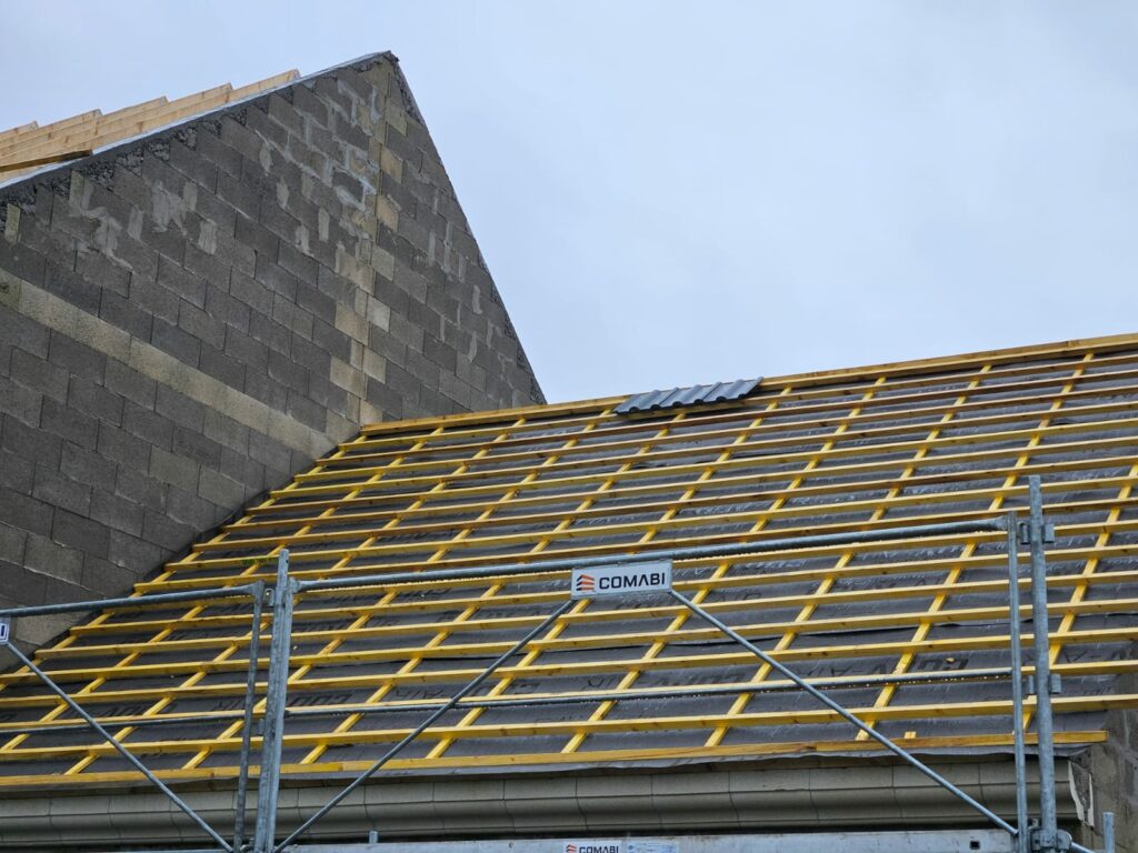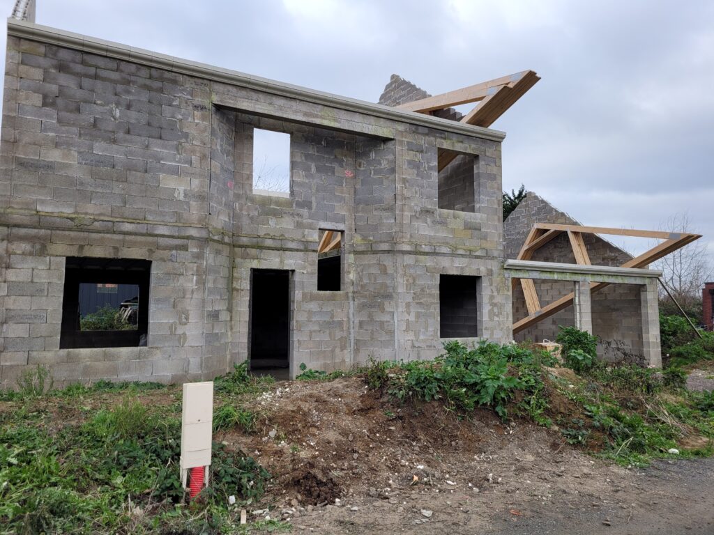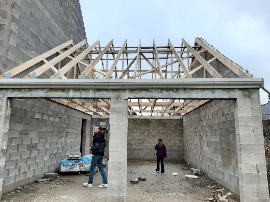 Quelques nouvelles de la maison, après une nouvelle pause dans les travaux de 3 mois. On en est resté là fin septembre, avec la charpente posée dans la maison, prête à être montée, mais sans ouvrier pour le faire. Finalement, après bien des reports, on a vu de l’agitation sur le chantier, et au mois de Fevrier, nous avons enfin eu notre toiture !