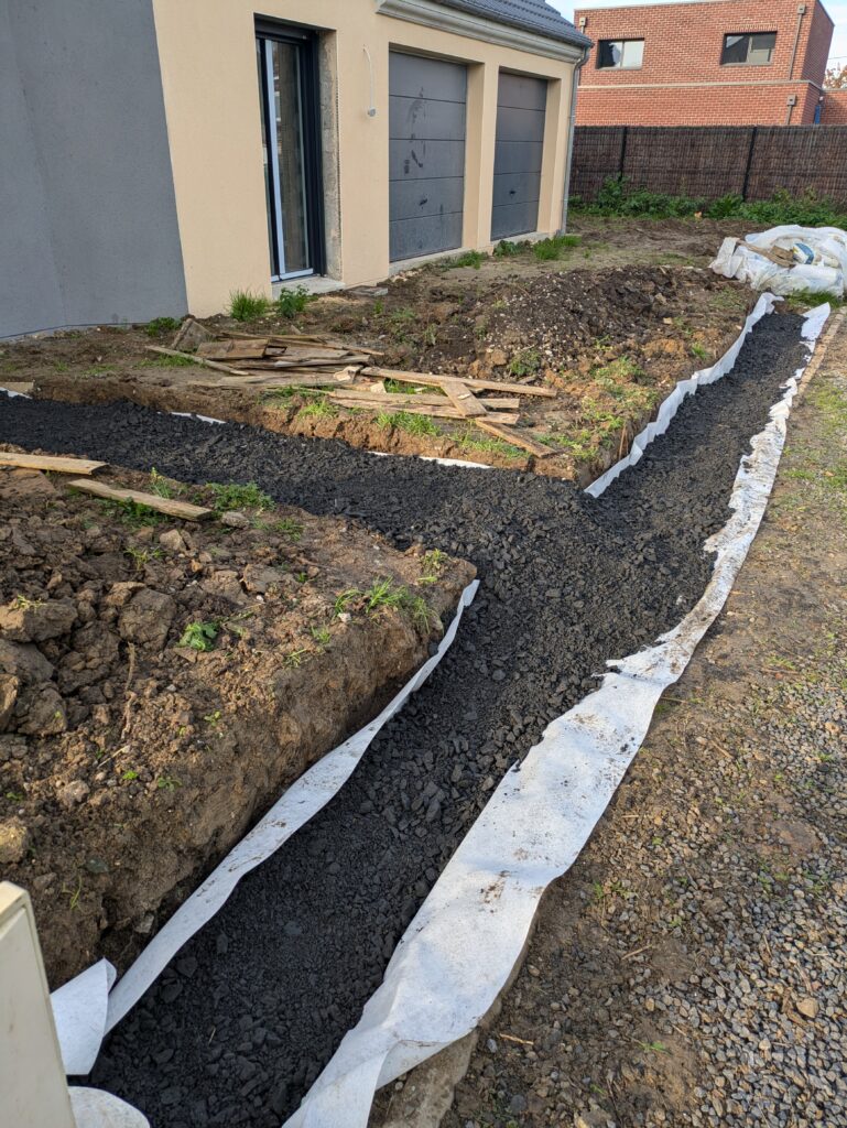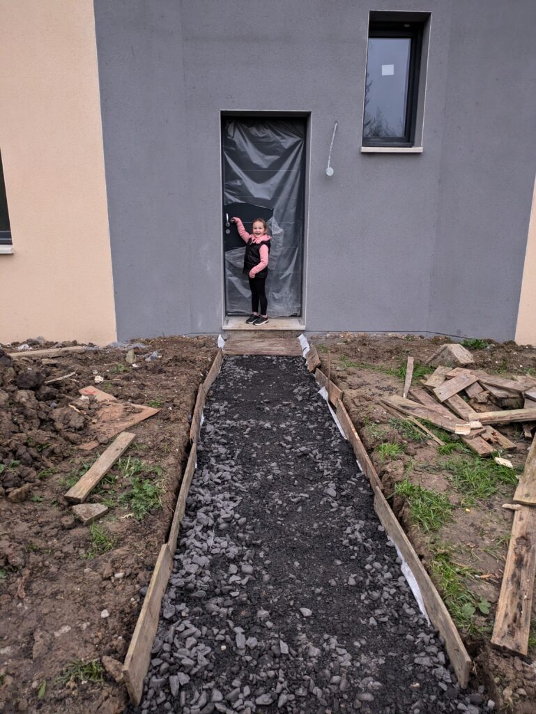 Nous avons aussi créé deux chemins de propreté provisoires pour pouvoir accéder à la maison sans mettre de la boue partout (un devant la porte d’entrée et un devant un des garages : non présent sur la photo)