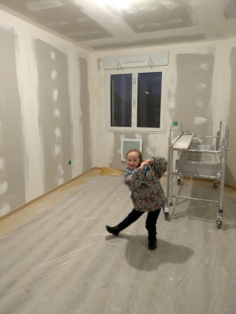 Depuis, le peintre s’est mis au boulot, il a très bien avancé. A ce jour, le haut est terminé, le bas presque et il reste la cage d’escalier et les portes à faire.