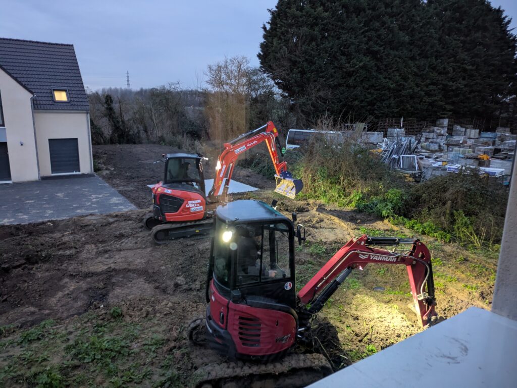 – il a fallut refaire les évacuations d’eau de pluie car les tuyaux n’étaient pas assez enfoncés et on aurait été coincé pour faire les travaux d’aménagement extérieur… (allez on débranche le cerveau et on joue à la terre…)